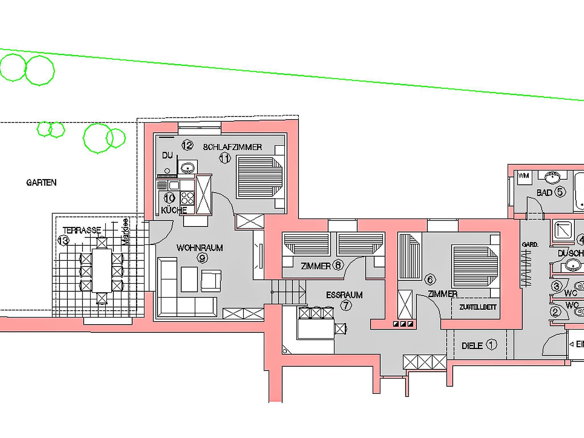 "Casa Hubertus", 4-Zimmer-Wohnung 110 m2, im Erdgeschoss. Komfortabel eingerichtet: Wohnzimmer mit Sat-TV (Flachbildschirm), Stereoanlage. Ausgang zum Garten, zur Terrasse. Offenes Esszimmer. 1 Doppelzimmer mit Dusche. 1 Zimmer mit 1 Bett und 1 Doppelbett. 1 Zimmer mit 2 Betten. Kleine Kochnische (4 Kochplatten, Geschirrspüler, Toaster, Wasserkocher, Mikrowelle, elektrische Kaffeemaschine). Bad, Dusche, 2 sep. WC's. Terrasse. Terrassenmöbel. Zur Verfügung: Bügeleisen, Haartrockner. Internet (WLAN, gratis). Bitte beachten: Maximal 1 Haustier/Hund erlaubt. Eigener Eingang. Das Wohnzimmer ist mit dem Esszimmer über eine kurze Treppe verbunden.