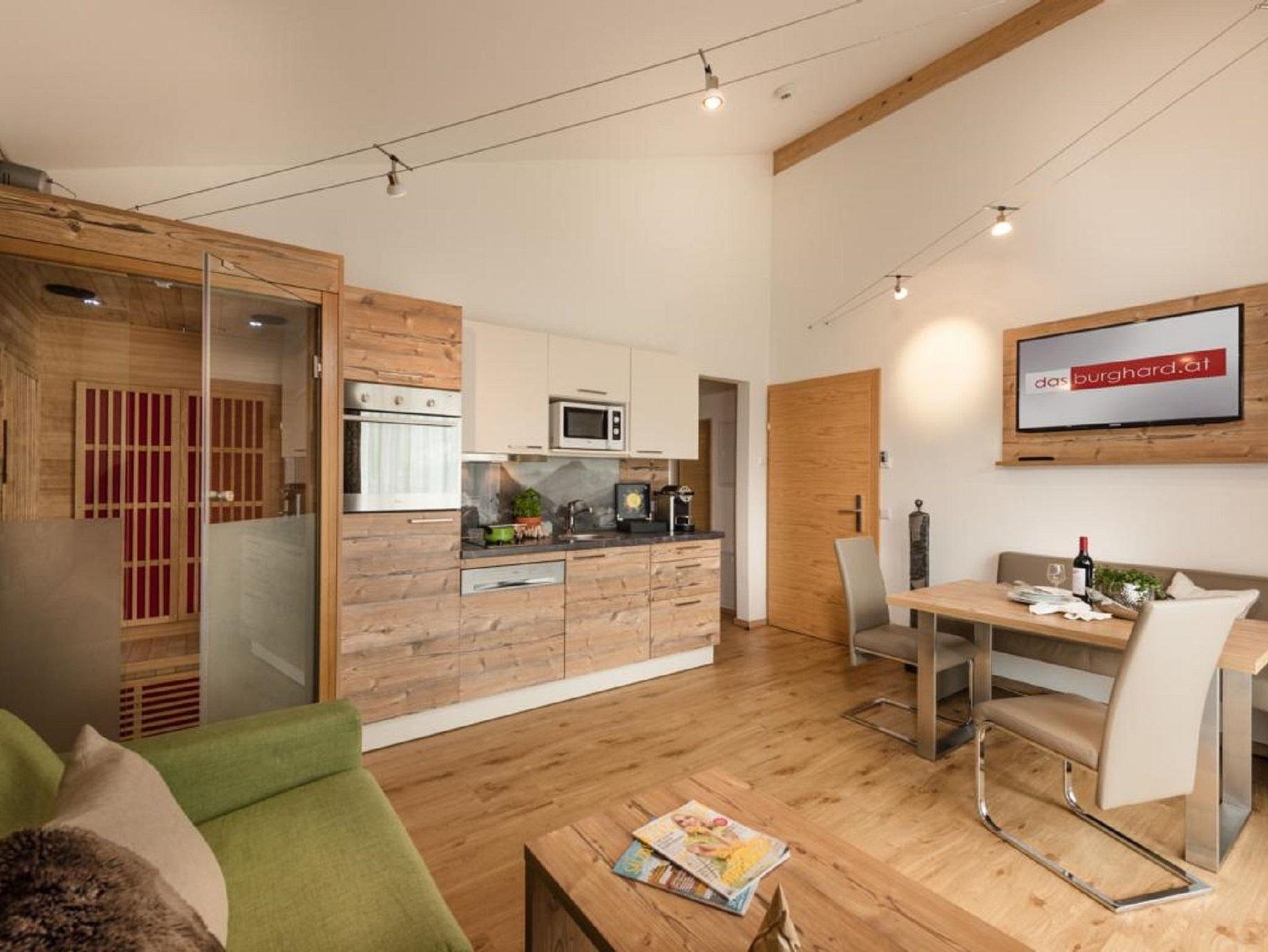 Im Dachgeschoss befindet sich die größte Ferienwohnung Obertauern mit 84,44 m². Somit ist genügend Platz für Sie, Ihre Freunde oder Ihre Familie. Das Appartement ist mit zwei großen Schlafzimmern ausgestattet. Es befinden sich zwei große Badezimmer mit Dusche WC und Haarfön sowie einem hellen, freundlichem Wohnraum mit Balkon in der Ferienwohnung Obertauern. Die Küche im lichtdurchfluteten Wohnraum ist voll ausgestattet. Weiters befindet sich ein ausziehbares Schlafsofa im Wohnraum. Der moderne Essbereich lädt zum gemeinsamen Dinieren ein. Entspannen sie sich in der Infrarotkabine.