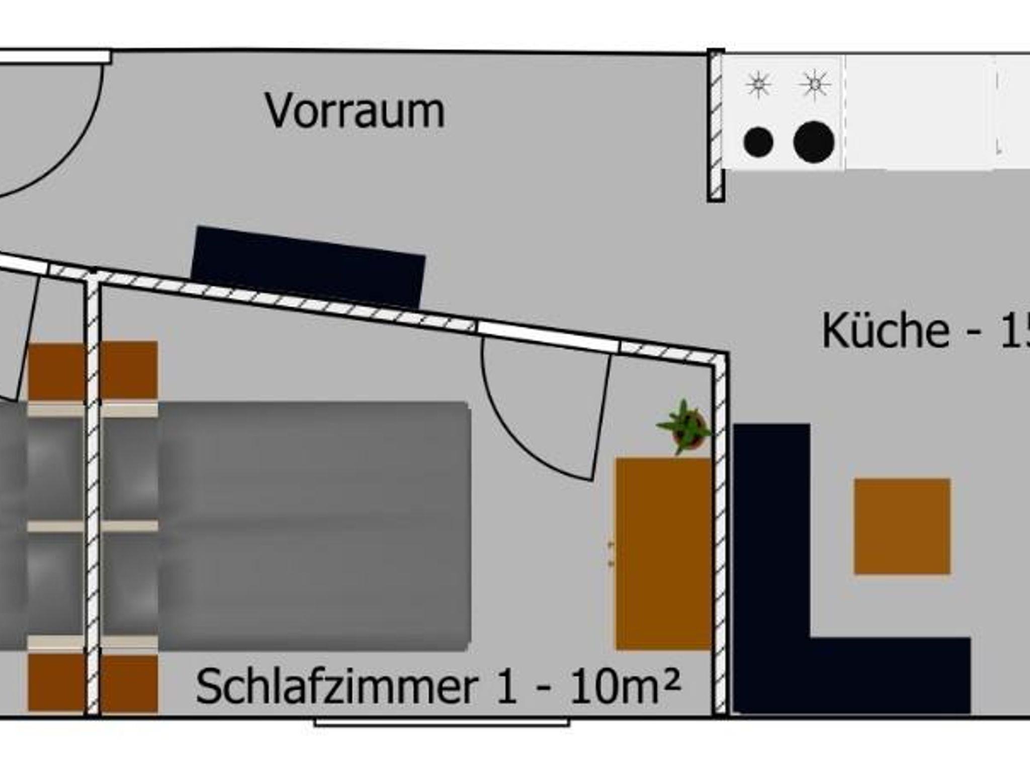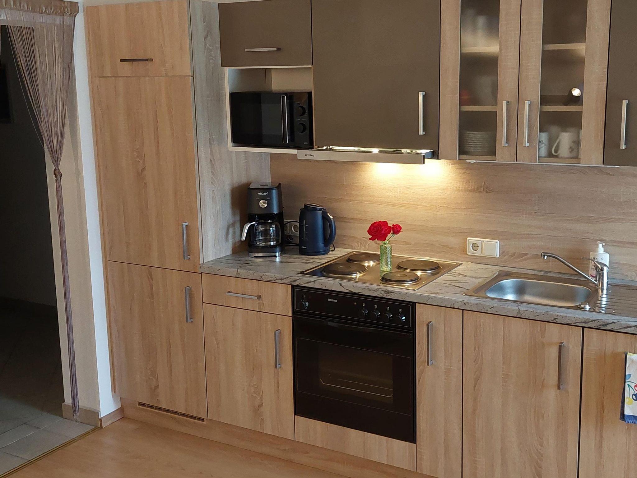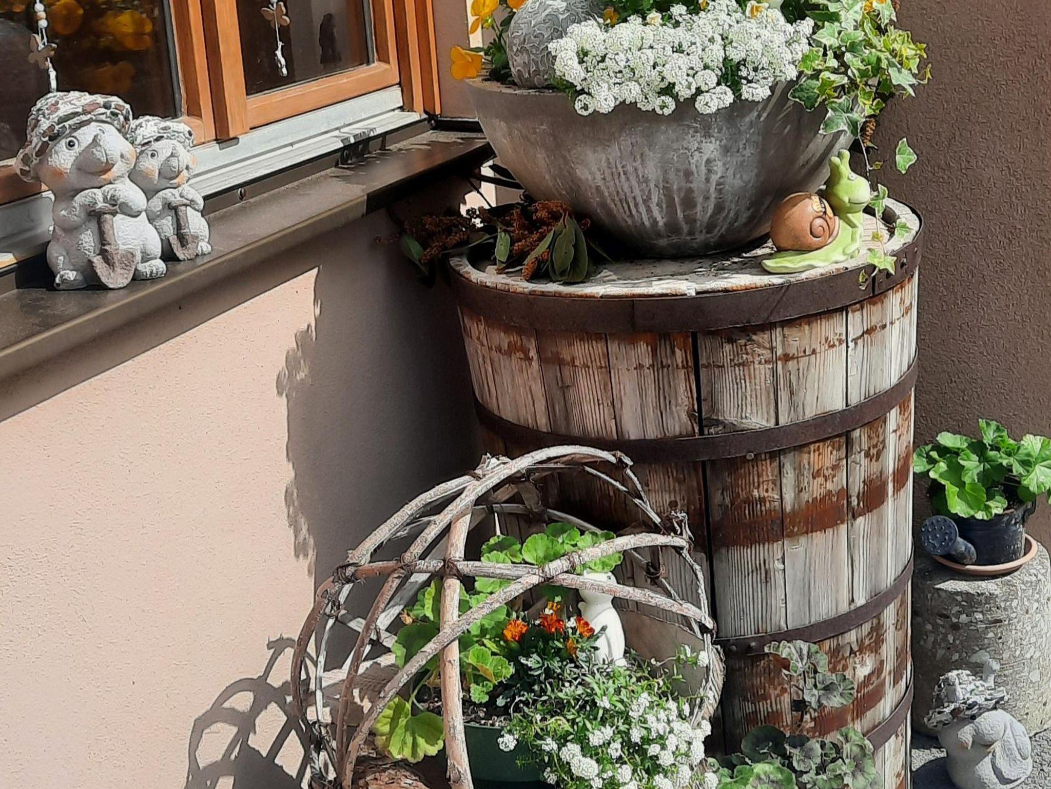 Die Ferienwohnung Gartenblick besteht aus einer großzügigen Küche mit Couch, zwei Doppelzimmer, 1 Stockbettzimmer, Dusche/WC.