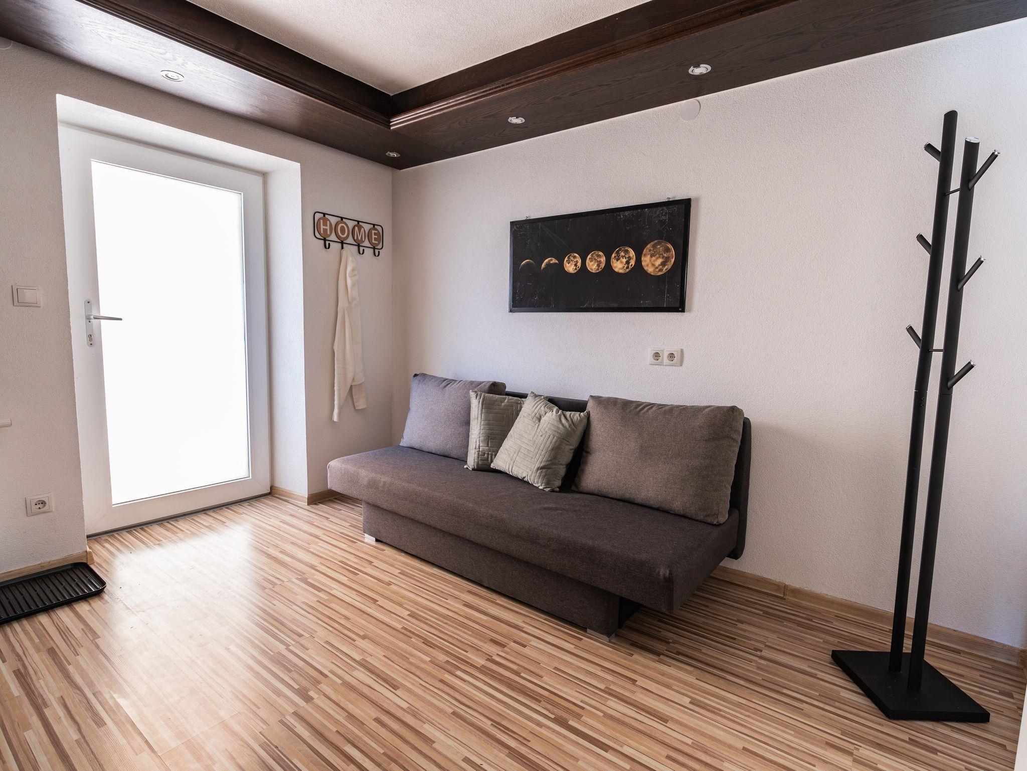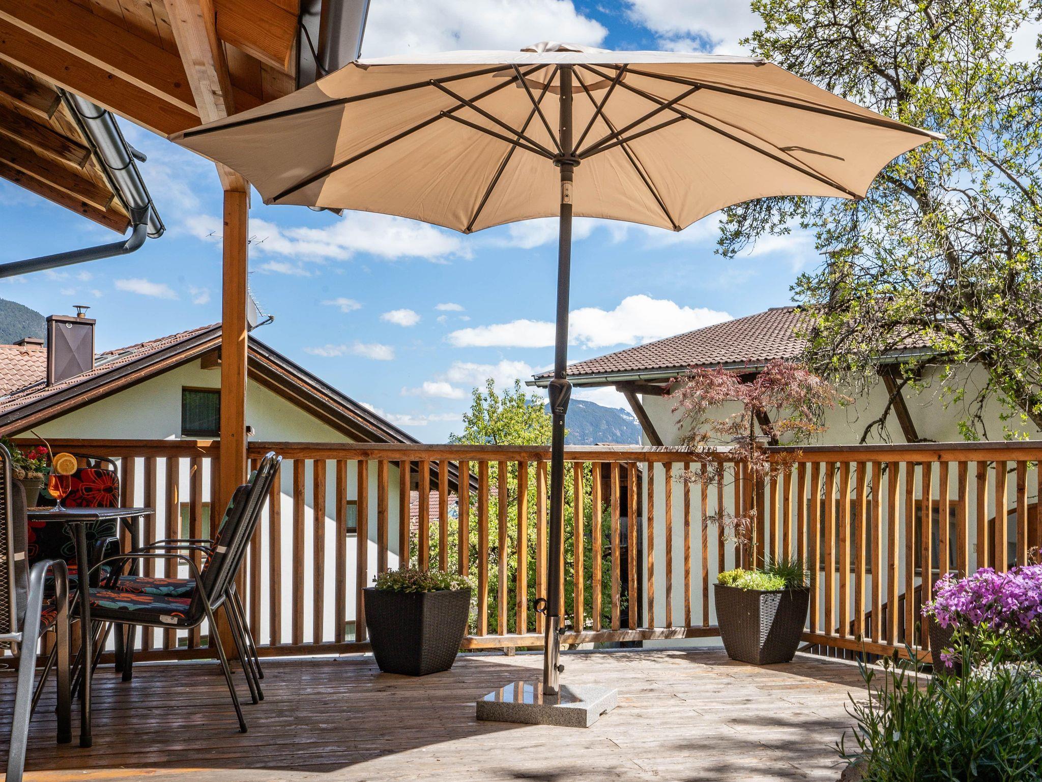 Das Appartement Orchidee bietet auf 54 m² Platz für bis zu 6 Personen. Es befindet sich im 1. Stock und verfügt über ein Schlafzimmer mit Doppelbett und weitere Schlafmöglichkeiten im Wohnzimmer und Vorraum mit jeweils einer ausziehbaren Couch. Die Küche ist komplett ausgestattet und bietet eine große Terrasse mit Essbereich und Blick auf die Berge.