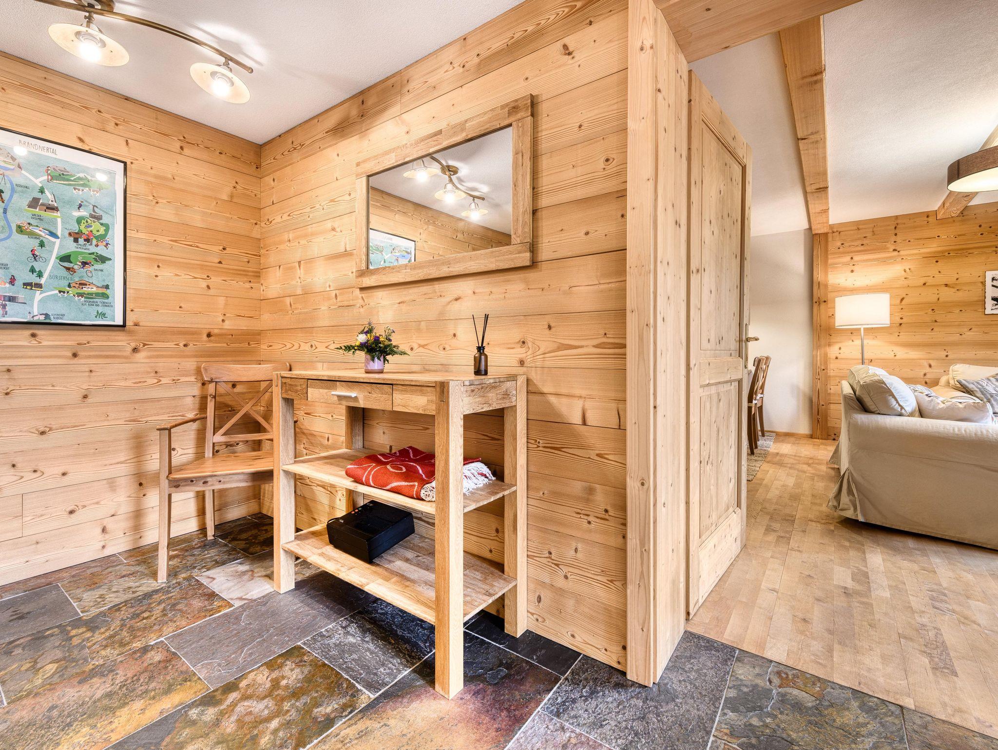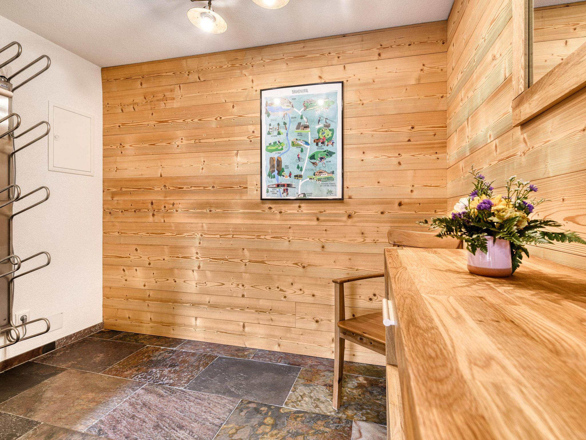 Das Appartement verfügt über einen praktischen Eingangsbereich mit Garderobe und Schuhablage sowie eine Ski-Ecke mit Skischuhwärmer. Der Wohnraum ist offen gestaltet mit einer voll ausgestatteten Küche, einem Essplatz für sechs Personen und einem gemütlichen Wohnzimmer, komplett mit TV-SAT und WLAN.