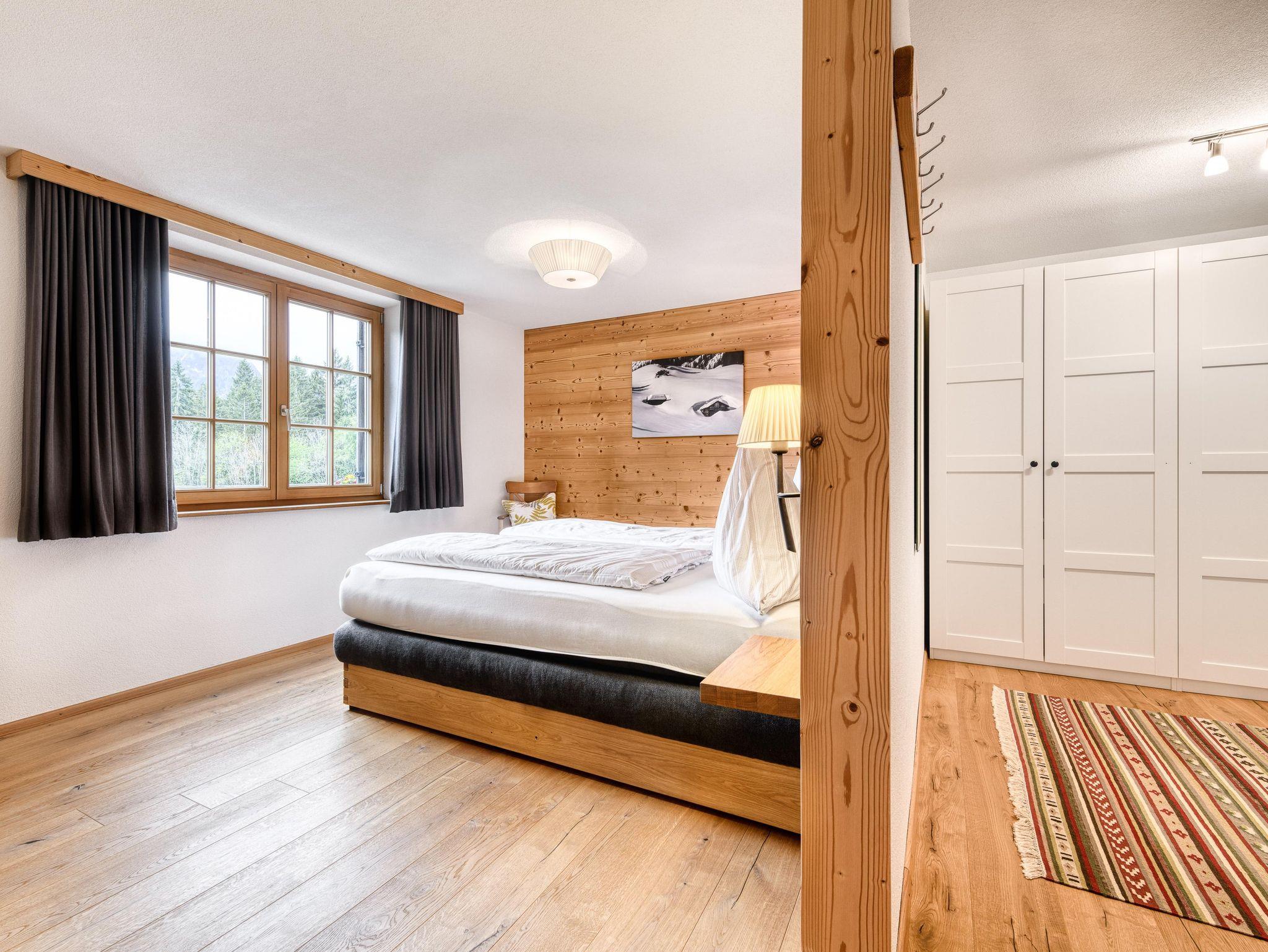 Zwei Schlafzimmer bieten jeweils ein Doppelbett und eine Kommode; zudem gibt es einen Ankleideraum mit großem Kleiderschrank und einem Zusatzbett. Ein modernes Badezimmer mit Dusche/WC ergänzt das Wohnangebot.