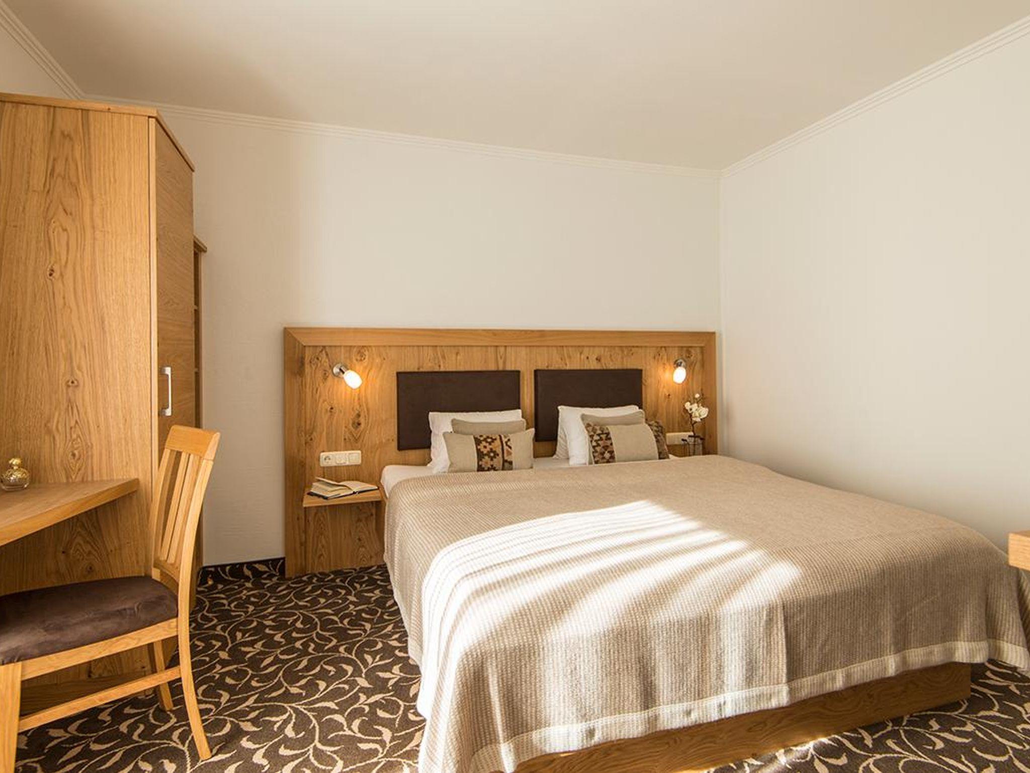 • helles Schlafzimmer mit Doppelbett und Komfortbettwäsche