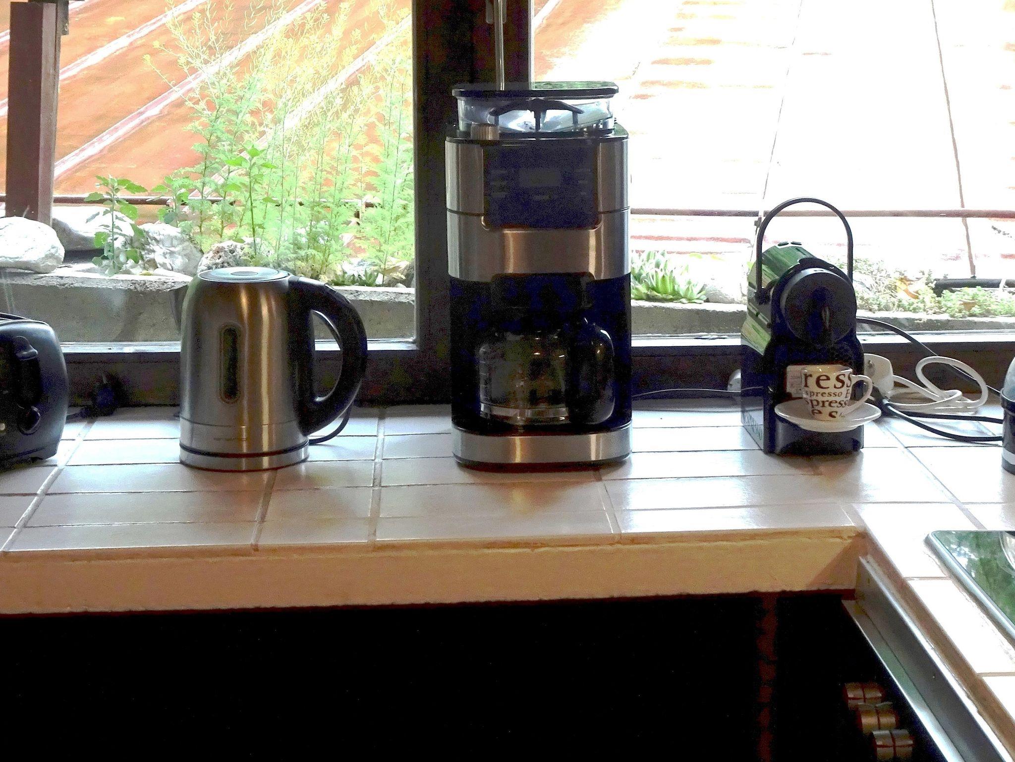 Für den duftenden Kaffee am Morgen gibt es eine Filterkaffeemaschine mit Mahlwerk sowie eine Nespresso Kapsel Kaffeemaschine.