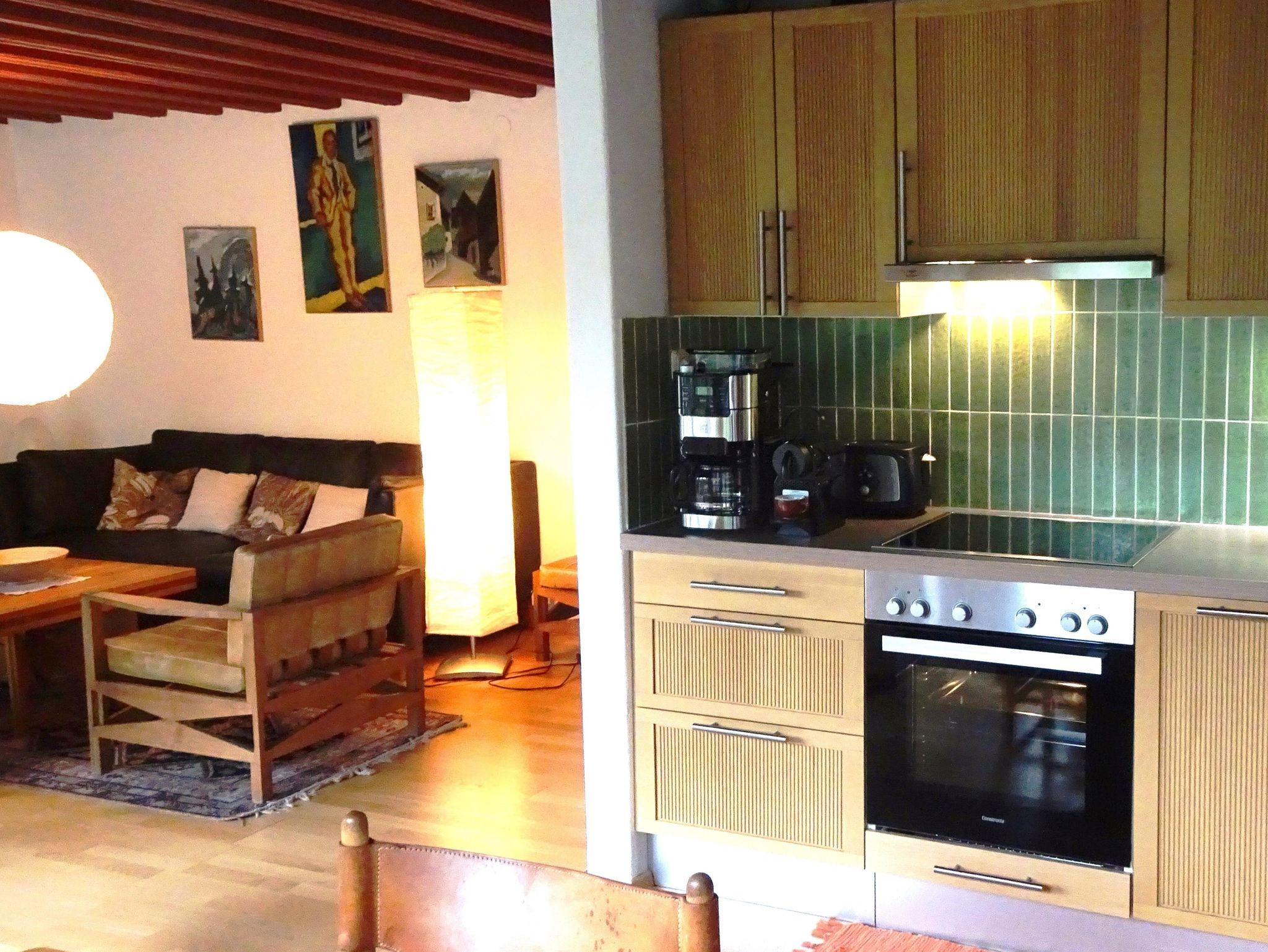 Die vom Architekten gestalteten Räume spielen mit persönlichem Flair, wie handgemalte Bilder , offen gestalteter Küche in kompletter Ausstattung und dem angrenzenden großen Esstisch für gesellige Abende, auch in größerer Runde. Am großen, offenen Kamin in der Raummitte lodert und