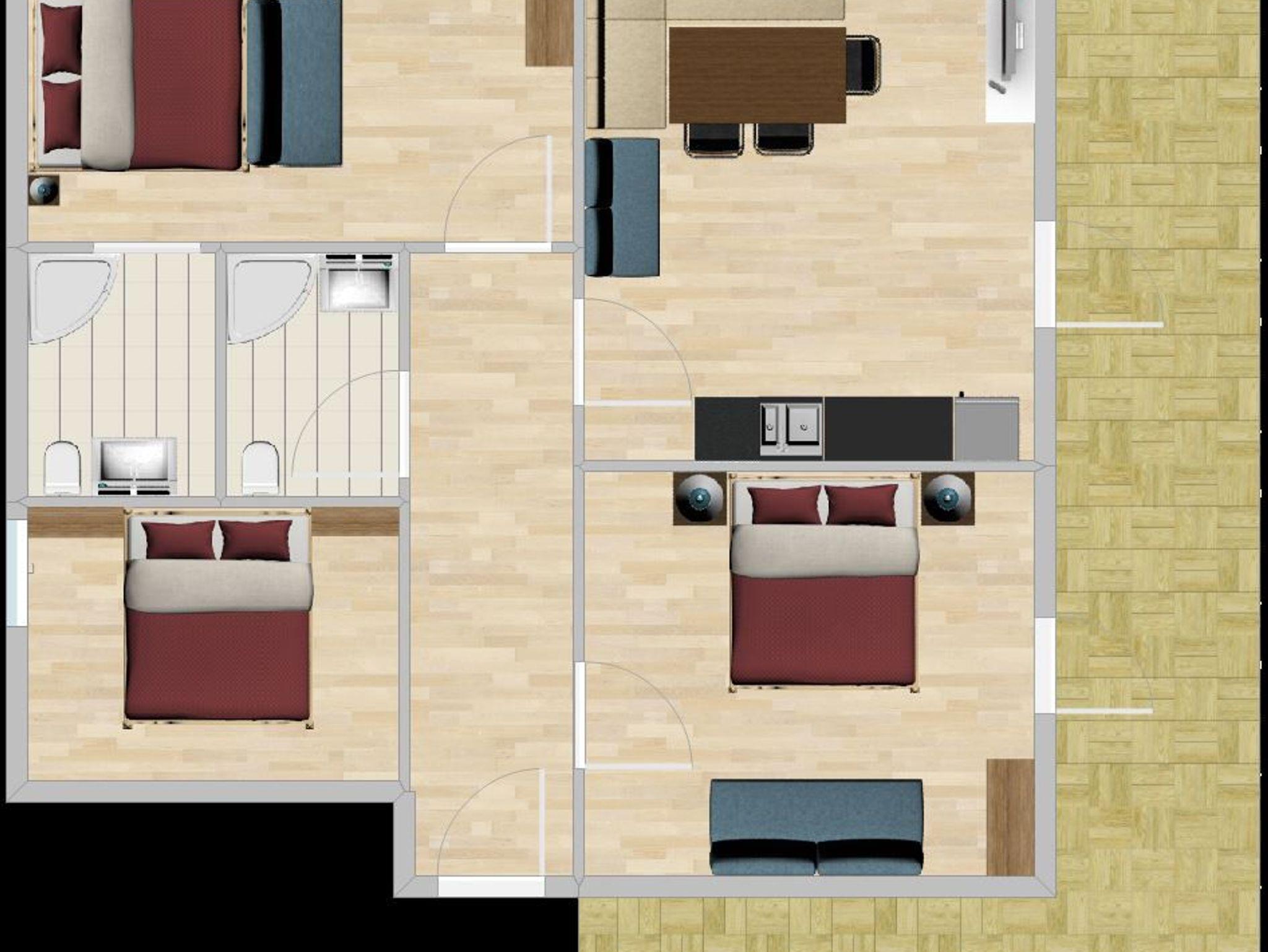 Geräumiges Appartement mit drei Schlafzimmern, einer großen neuen Küche mit einem Ess-/Wohnbereich mit Sat-TV sowie zwei kleinen Badezimmern mit Dusche WC. Freuen Sie sich auch auf einen Südbalkon mit Blick auf die umliegenden Berge und die Seilbahn sowie den Garten und Pool.