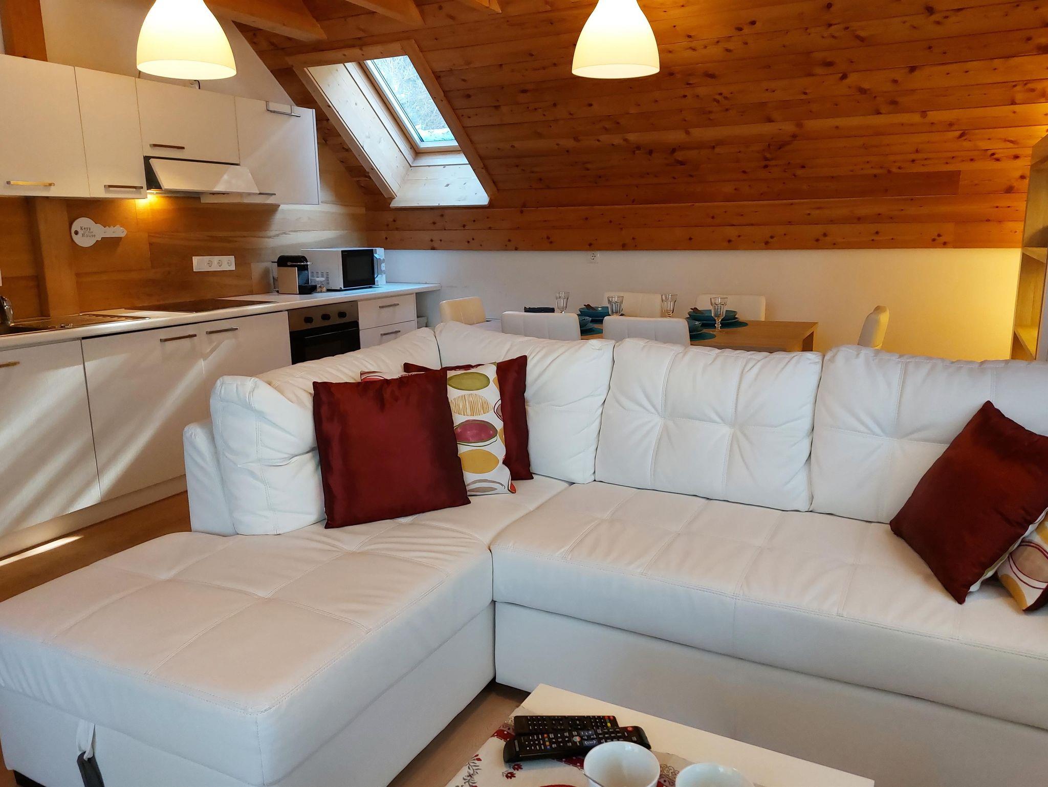 Wunderschöne neue Ski-to-door Wohnung auf zwei Ebenen in panoramischer Lage. Drei Schlafzimmer mit Doppelbett, zwei komplette Bäder mit WC, Waschbecken, Dusche und Bidet, bequemes Wohnzimmer mit Küche, Esstisch für 6 Gäste, Couch und Holzofen und Zugang zu einem tollen Balkon mit Blick auf Tal, Dorf und Skipiste. Eine Waschmaschine steht zur Verfügung, wie auch zwei bedeckte Parkplätze und ein Abstellraum für sportliche Ausrüstung (Ski, Skischuhe und Fahrräder). Im Winter kann man mit den Skischuhen an einfach die Strasse überqueren und man kommt zur Skipiste der Skischule für Kinder, die auch als Verbindungspiste zum Maibrunn Sessellift dient.