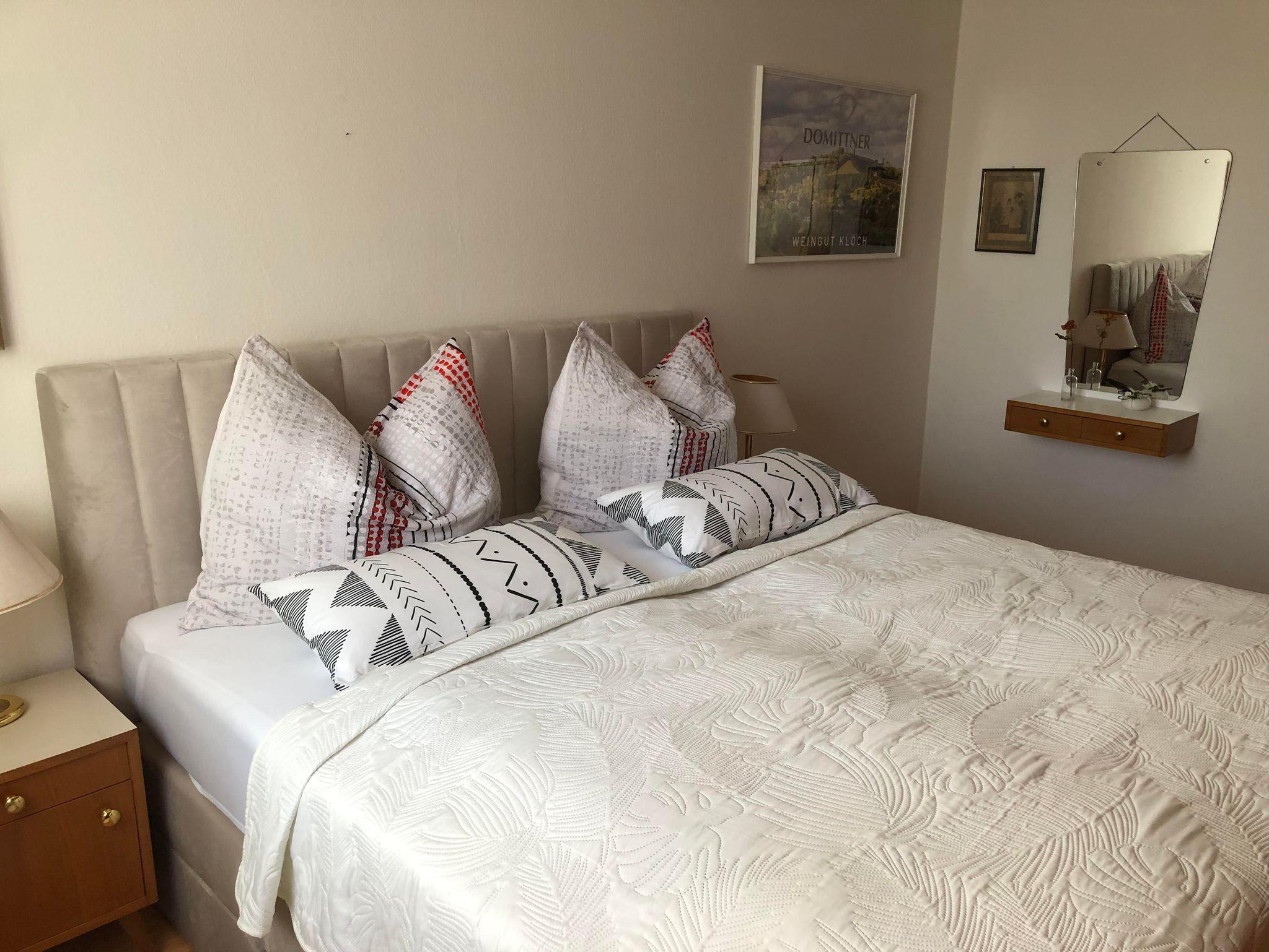 Im 2. Stock (breiter Stiegenaufgang) befindet sich die abgeschlossene Ferienwohnung „Apartment Sauvignon Blanc“. Modernes wurde mit Bestand kombiniert. Wir finden diese Wohnung mit faszinierendem Ausblick auf Park/Dachlandschaft, Musikschule und Stadtpfarrkirche „richtig peppig“. Platz ausreichend vorhanden, Charme ebenso. Das Apartment verfügt über ein Schlafzimmer, ein Wohn-/Schlafzimmer, eine große Küche mit modernem Essplatz, ein Bad (Dusche), ein WC (getrennt) und einen kleinen Vorraum.