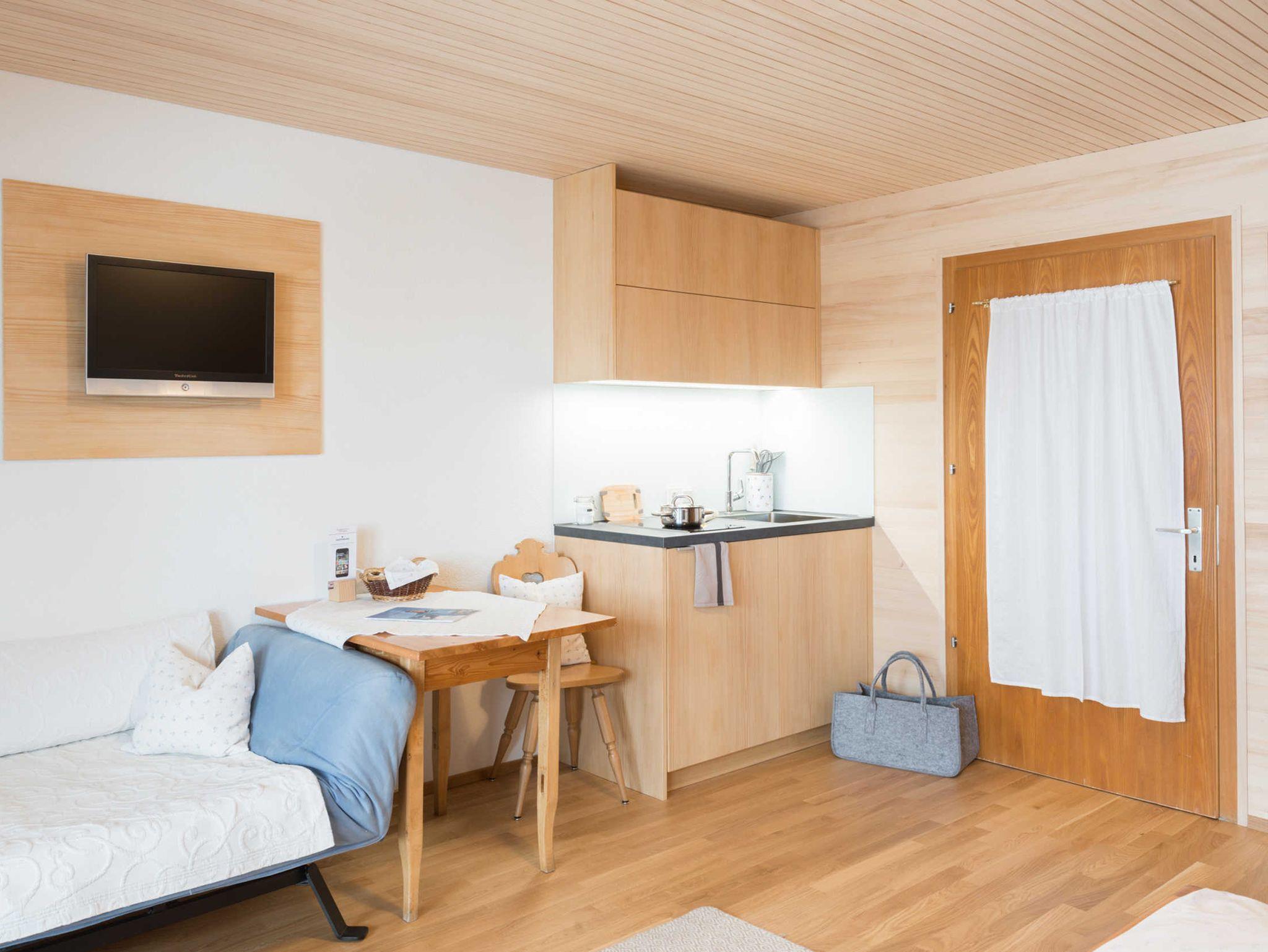 Das Appartement besteht aus einem Wohnschlafzimmer, das für 2 Personen ausgelegt ist, einem seperaten Bad mit Dusche und WC, einer kleinen Miniküche und einem TV. Die Wohnung ist nach Süden ausgerichtet und vom Balkon aus kann die wunderbare Aussicht auf die Kanisfluh genossen werden.