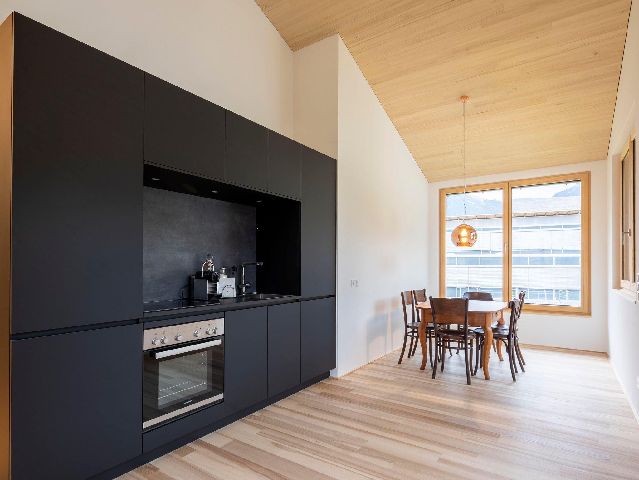 Apartment sechs im Obergeschoss bietet auf 69 m² Platz für 2 bis 6 Personen und beeindruckt mit seinem stilvollen Design, der durchdachten Raumaufteilung und einem gemütlichen Holzofen. Genießen Sie beim Frühstück den Panoramablick auf die umliegenden Berge und lassen Sie sich vom natürlichen Licht durch die großen Fenster verwöhnen.