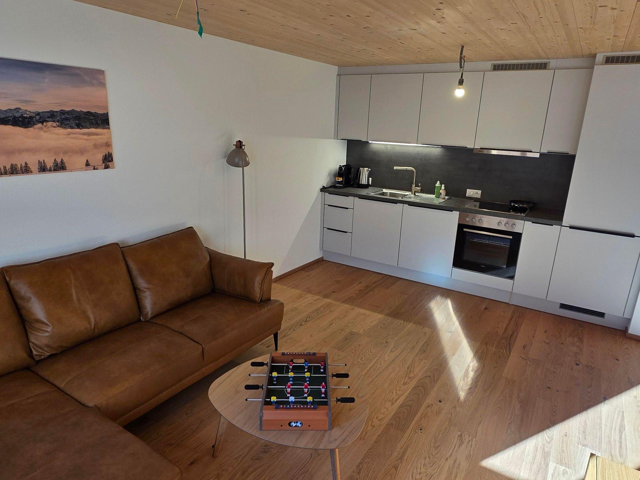 Unser Apartment verfügt über zwei Schlafzimmer, ein helles Wohnzimmer, eine komplett ausgestattete Küche und ein modernes Bad. Große Fenster lassen das Alpenlicht herein und bieten eine wunderschöne Aussicht auf die umliegende Bergwelt. Das Apartment ist sonnig, gemütlich und mit viel Liebe zum Detail eingerichtet.