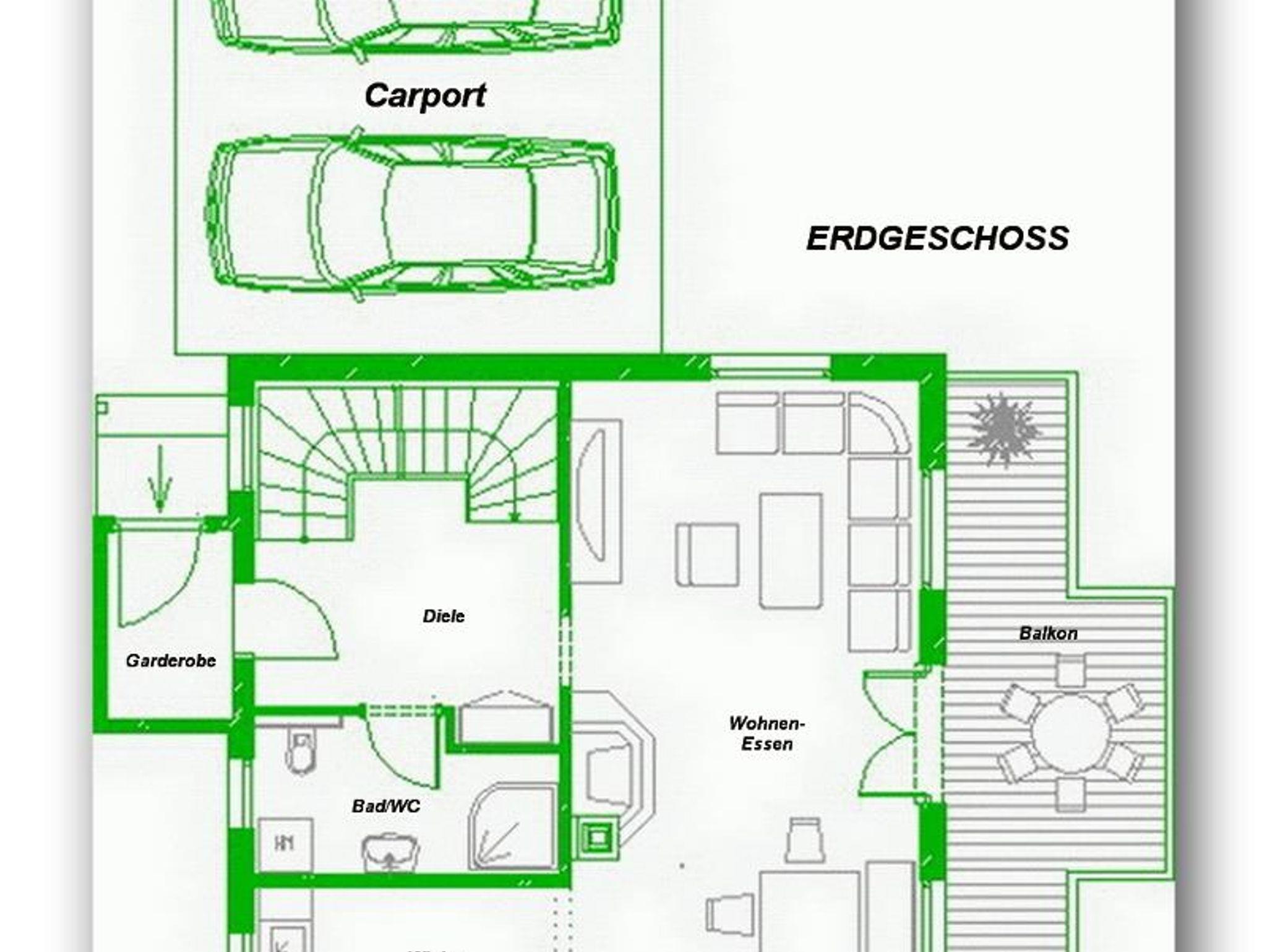 Im Erdgeschoss: Carport für zwei PKW, sowie Windfang, Diele, Bad, WC und ein großzügiger Wohnbereich samt gemütlicher Wohnlandschaft und Essplatz. Natürlich mit offenem Kamin und SAT-LCD Flachbildfernseher samt DVD und Video sowie Internetanschluss (W-LAN). Eine modernst ausgestattete Topküche und ein riesiger Panoramabalkon mit Fernblick laden zum Schlemmen ein.