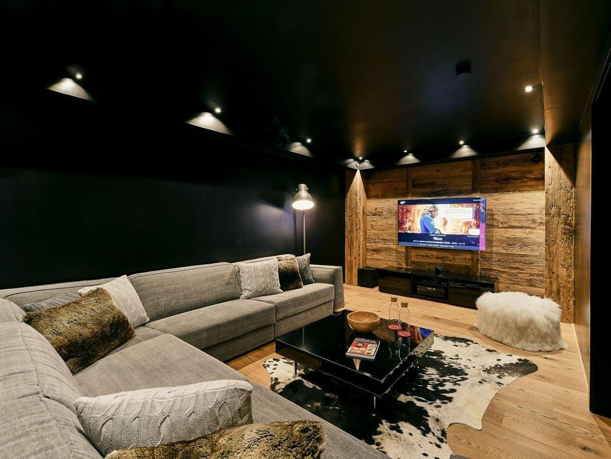 Wohnzimmer im gemütlichen Alpenstil mit Holz-Verkleidung
