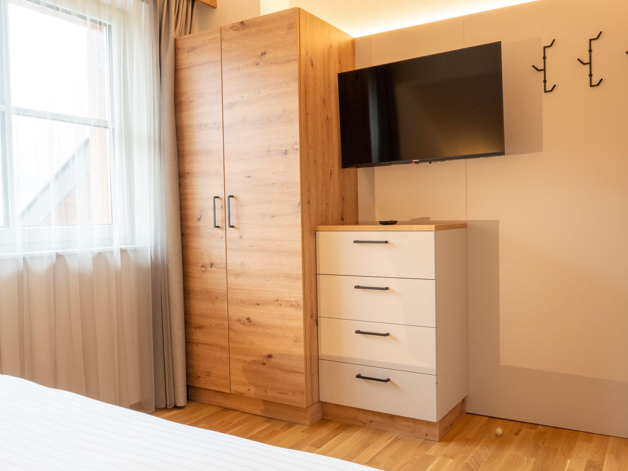 • geräumigen, Vollholz-möblierten Einzel-, Doppel-, Familienzimmern und Studios mit Boxspringbetten in „Treca“ Topqualität, Dusche oder Badewanne, separatem WC