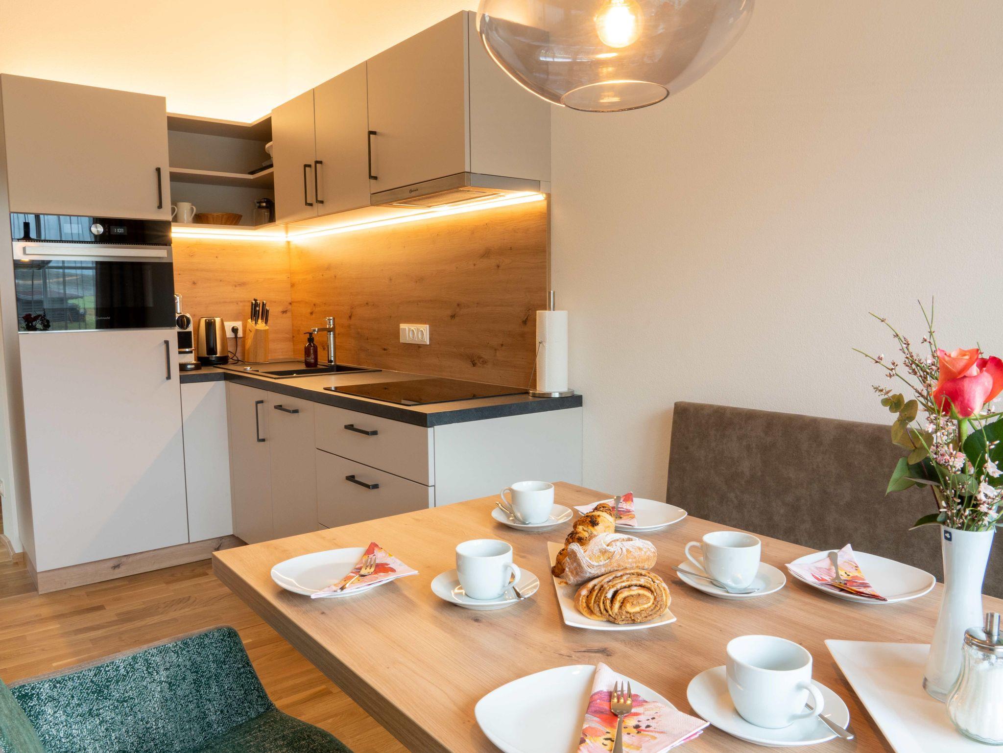• nagelneuen, topausgestatteten Ferienwohnungen für 1 – 6 Personen mit Wohnküche inkl. „Kitchen-Kit“, 1-2 Schlafzimmern mit hochwertigen „Voglauer“ Betten inkl. Bettwäsche, 1-2 Badezimmern inkl. Handtücher und Haarfön sowie modernen Annehmlichkeiten wie Smart-TV in jedem Zimmer, WLAN, Geschirrspüler, Kühlschrank mit Gefrierfach, Backofen mit Mikrowellenfunktion u.v.m.