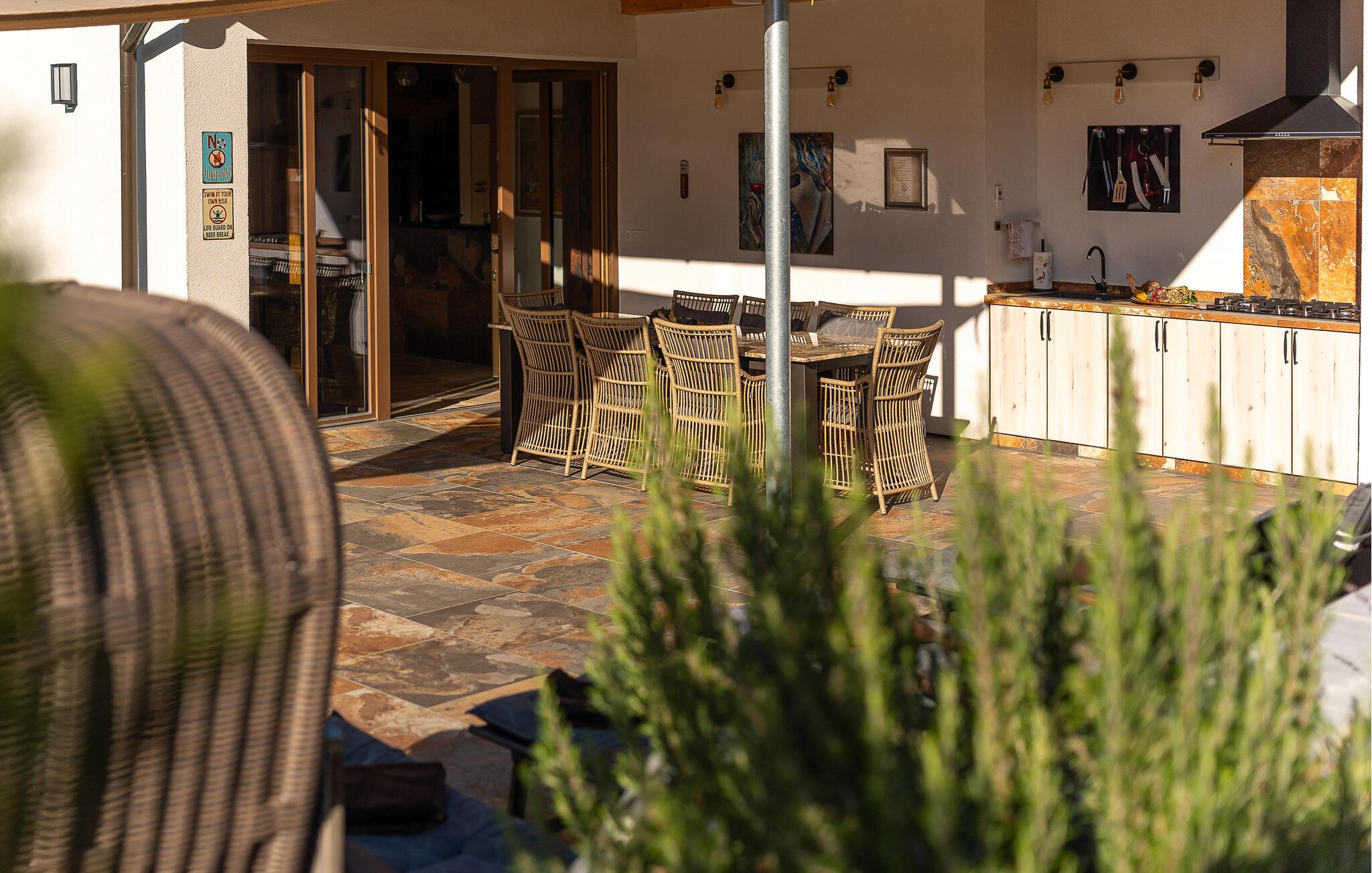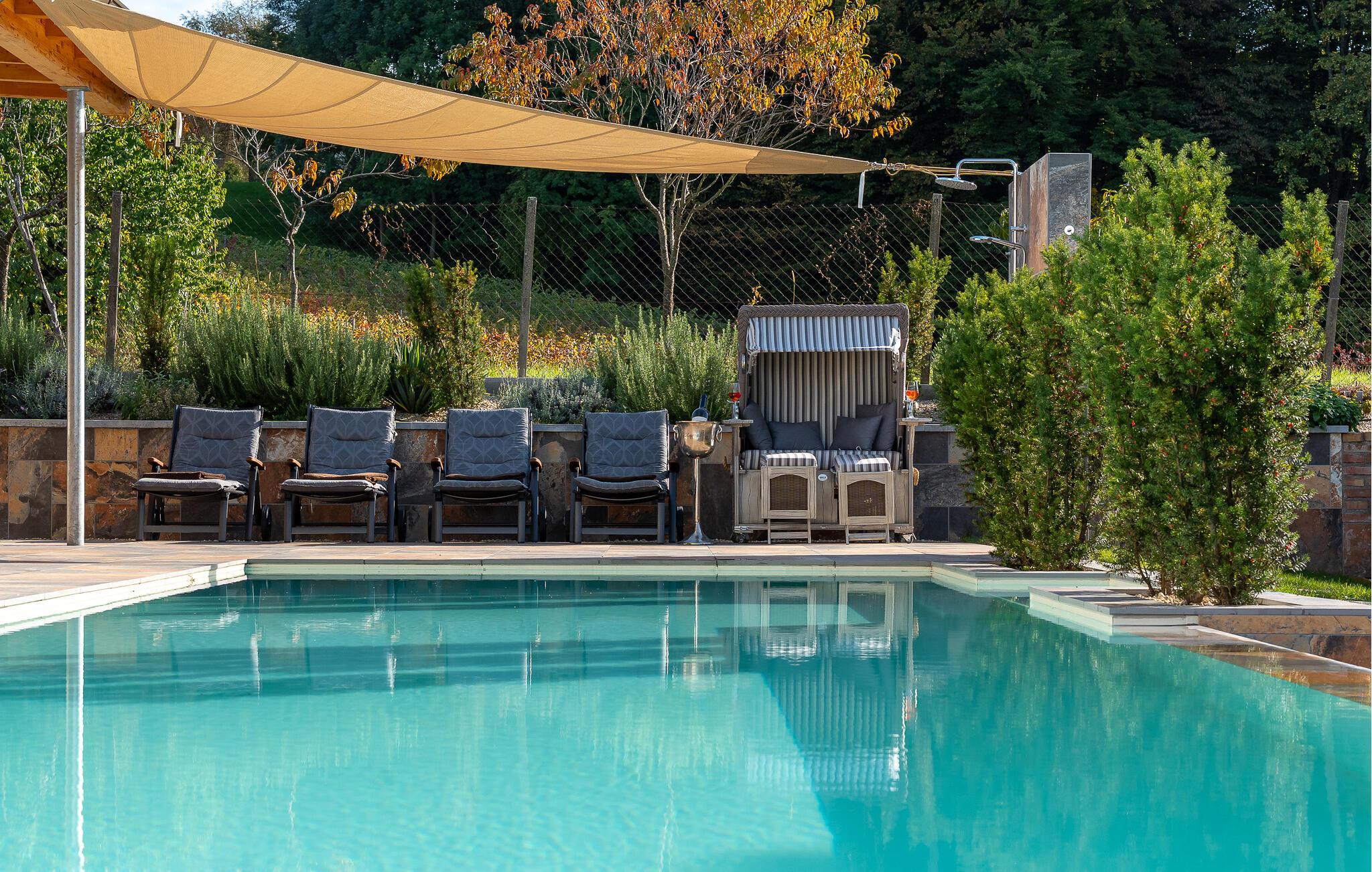 Genießen Sie im Garten und auf der Terrasse die Sonne, der große Pool bietet wohltuende Erfrischung an heißen Tagen.