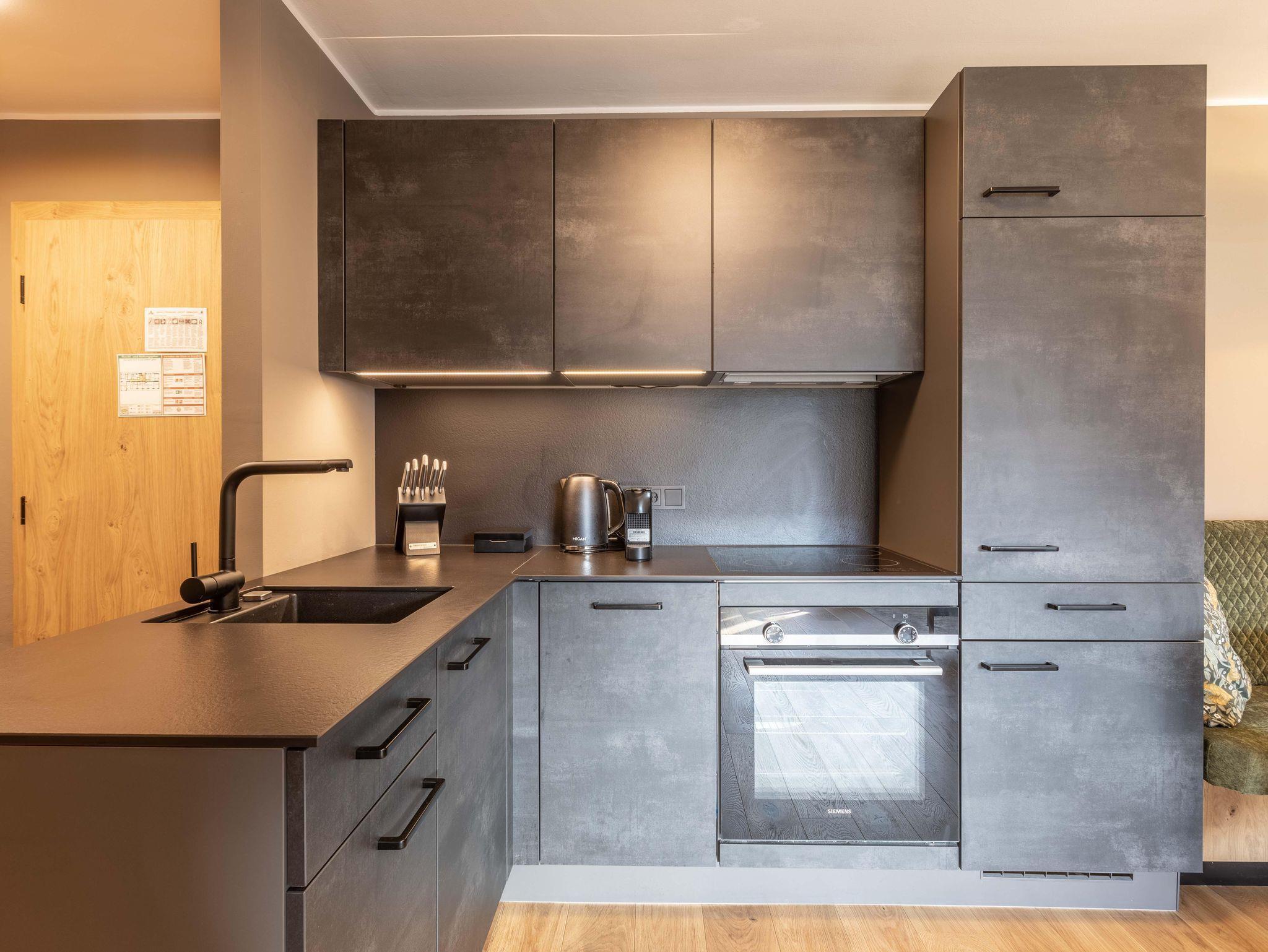 Das Apartment für 8 Personen bietet 2 Schlafzimmer (jeweils Boxspringbett und Balkonzugang), 2 Wohn/Esszimmern (jeweils Ausziehcouch) und 2 Bäder (je ein zusätzliches separates WC) und Balkon. Der Eingangsbereich, mit Garderobe, führt direkt in die Wohnküche (Balkonzugang), welche mit Esstisch, TV, Kleiderschrank und einem Ausziehsofa ausgestattet ist. Die Küche ist mit Küchengeräten, Kühl-Gefrierkombi sowie Nespresso Kaffeemaschine ausgestattet und verfügt außerdem über Küchengeschirr.