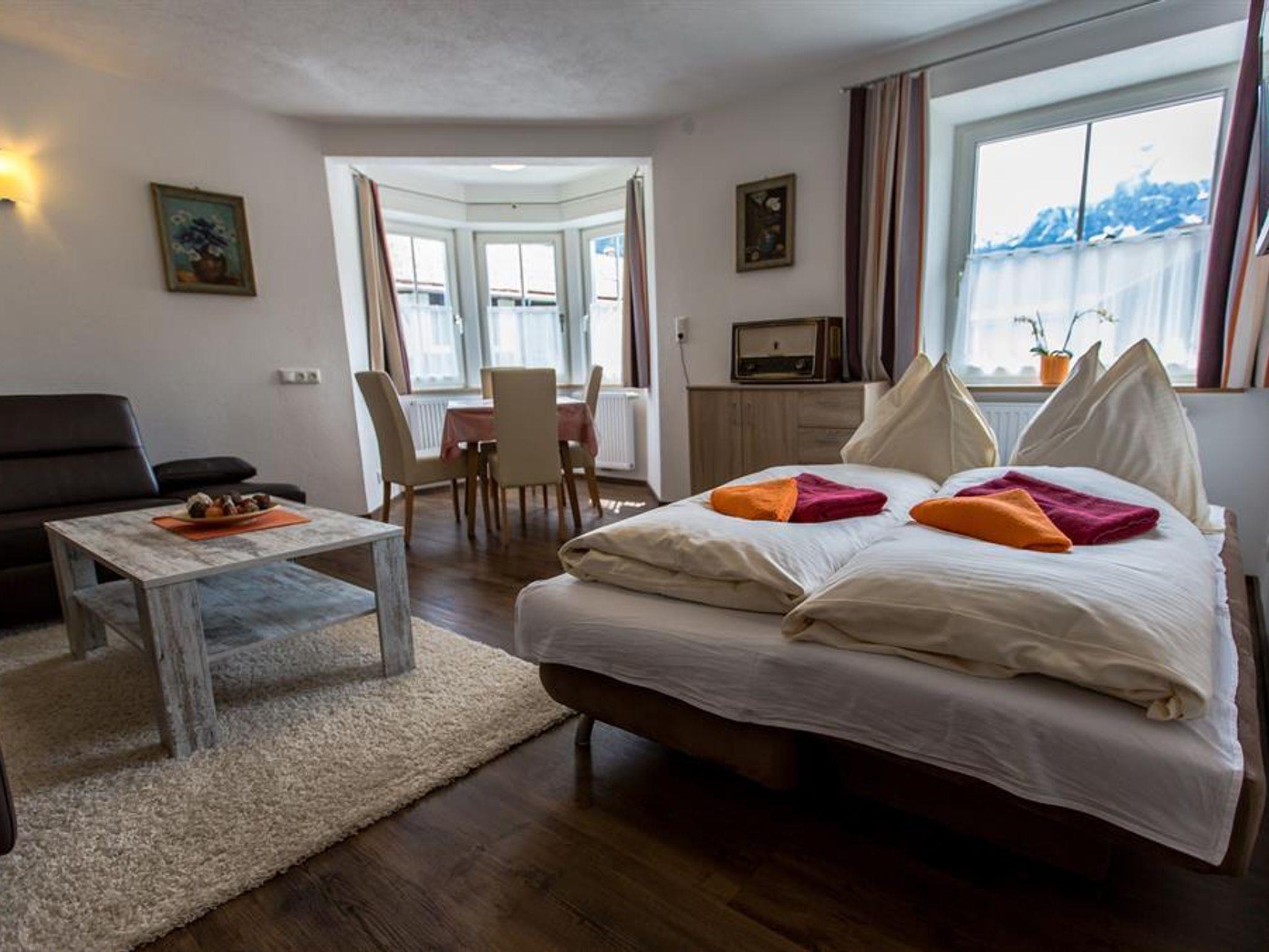 Neu eingerichtete Ferienwohnung Zugspitze mit 70m2 im 1. Sock Schlafzimmer mit Doppelbett und Einzelbett (Bettwäsche vorhanden), Waschbecken und Flat-TV Weiteres Schlafzimmer mit Doppelbett (Bettwäsche vorhanden), Waschbecken und Flat-TV Wohn- Schlafraum mit ausziehbarer Schlafcouch, Erker, Esstischgruppe, Flat-TV. Komplett eingerichtete Küche - Elektroherd mit Backrohr , Kaffeemaschine(Tassimo), Geschirrspüler, Mikrowelle, Toaster, Tisch- und Kochgeschirr) mit gemütlicher Sitzecke. DU/WC (Frotteewäsche vorhanden) Internet via W-LAN