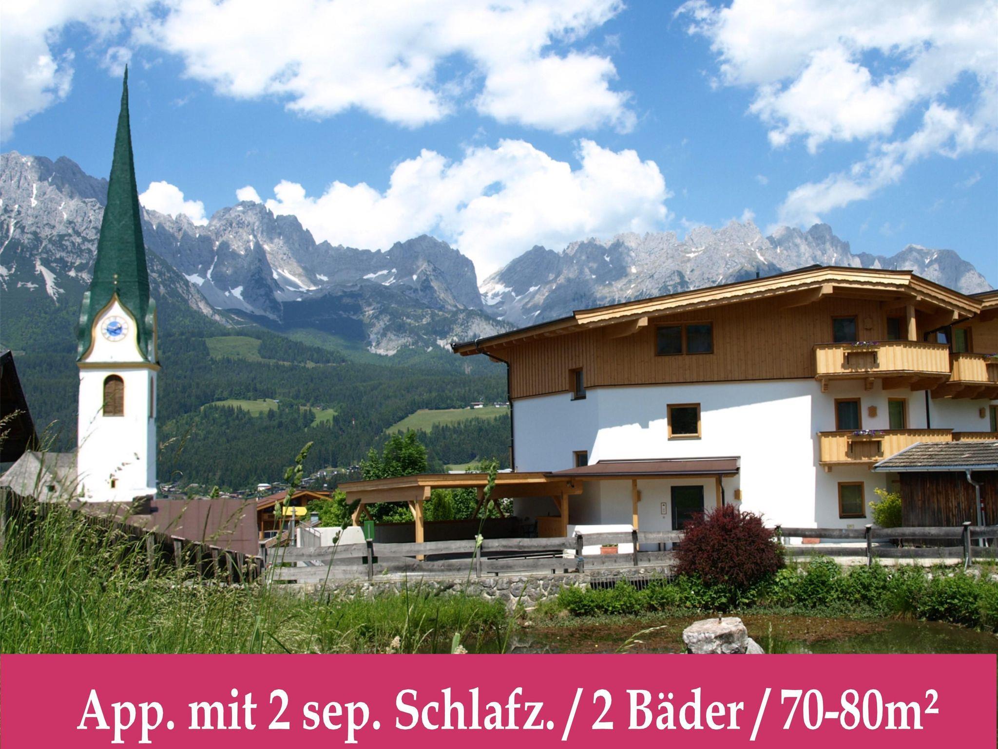 Ihr *Urlaubs-Zuhause daheim am Wilden Kaiser..... mit: neuwertigen Landhauswohnungen je 50 - 80m², mit zwei sep. Schlafzimmer, zwei Bäder, Wohnküche und Balkon mit Panoramablick