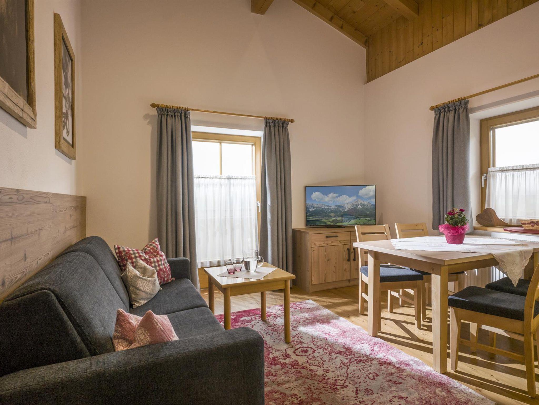 Wohnküche mit Essecke, Mikrowelle, E-Herd, Backofen, Spülmaschine, Kabel-Flat-TV, Radio, CD-Player, Telefon, W-Lan-Internet, Safe, Doppelbettcouch. Ein Schlafzimmer mit Dusche/WC, zweites Schlafzimmer mit Schreibtisch. Bad/WC: Das Appartement verfügt über ein zweites Bad und ein separates WC Ein Balkon auf der Nordseite mit herrlichem Blick zum Wilden Kaiser und auf den Golfplatz, ein Balkon auf der Südseite Für jedes Appartement steht ein Garagenplatz zur Verfügung Skikeller mit Schuhheizung