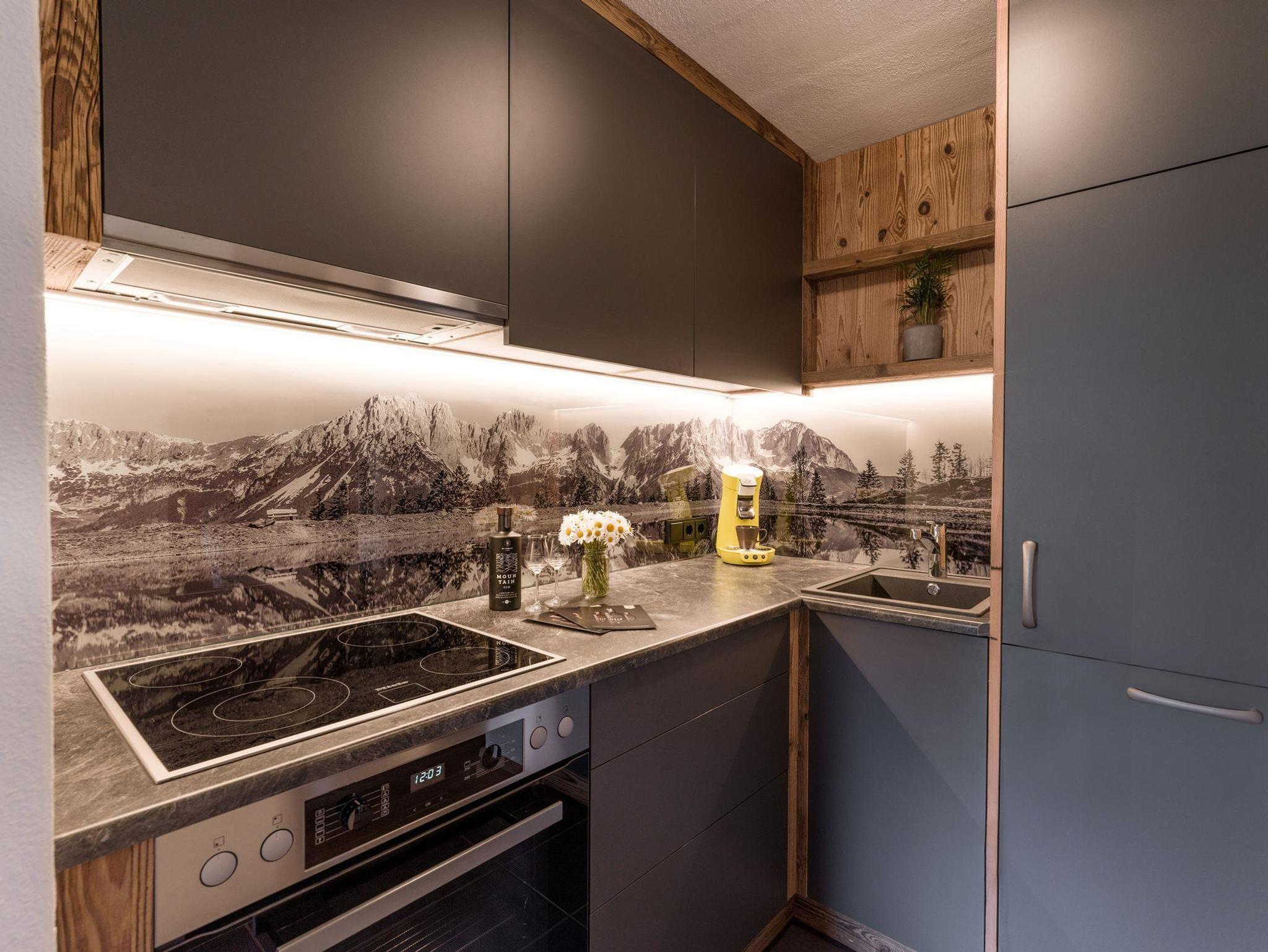 Wir bieten Ihnen ein gemütliches Appartement für 2-5 Personen mit eigenem Eingang und DIREKTEM Blick zum Wilden Kaiser. 2 getrennte Schlafräume, alle Türen, wurden aus „Zirbenholz“ Hand gefertigt! Das Appartement im ländlichen Stil verfügt über einen durchgehenden Balkon, komplett eingerichtete Küche, Geschirrspüler, gemütlicher Wohnraum, Flat-TV, Sat-TV, W-Lan, Dusche mit separatem WC. Brötchenservice.