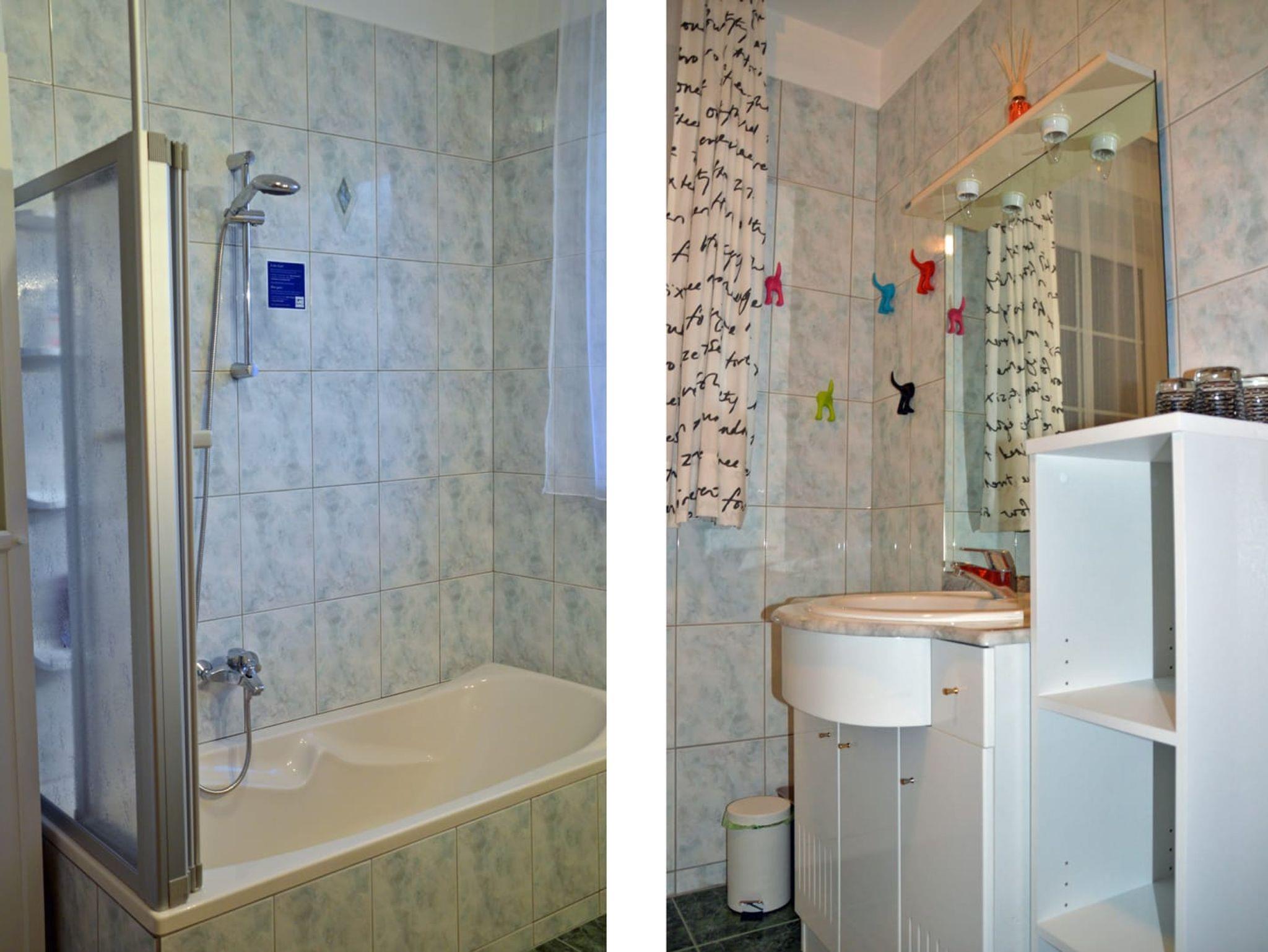 Die Wohnung besteht aus einer großen Wohn-Küche mit ausziehbarer Bank (integrierte Matratze) für 2 Personen, einem Schlafzimmer mit Doppelbett und zusätzlichem Schlafsofa, einem großen Badezimmer mit Badewanne inklusive Dusche und Waschmaschine, einer separaten Toilette, einem großen Schrankraum und einem Abstellraum im Eingangsbereich.