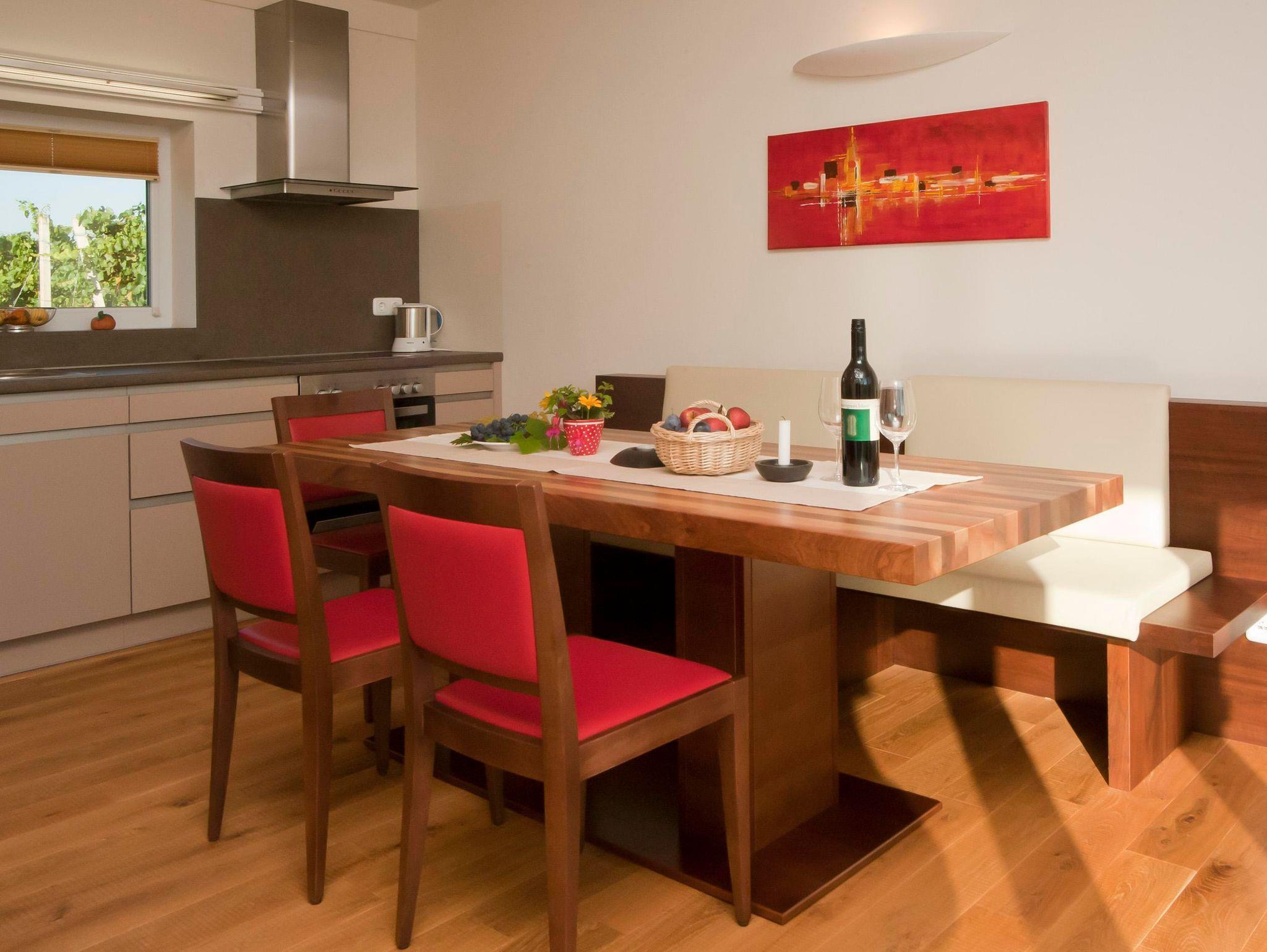 Tischlergefertigte Vollholzmöbel in Zirbe und Nuss, Dielenböden in Eiche, eine gemütliche Winzerstube, eine schwebende Weingartenterrasse, eigene Sauna und hochwertige tueri-Lebensenergiebetten von Tischlermeister Franz Gross sind genau das Richtige für den anspruchsvollen Gast, der seinen Urlaub in vollen Zügen genießen möchte.