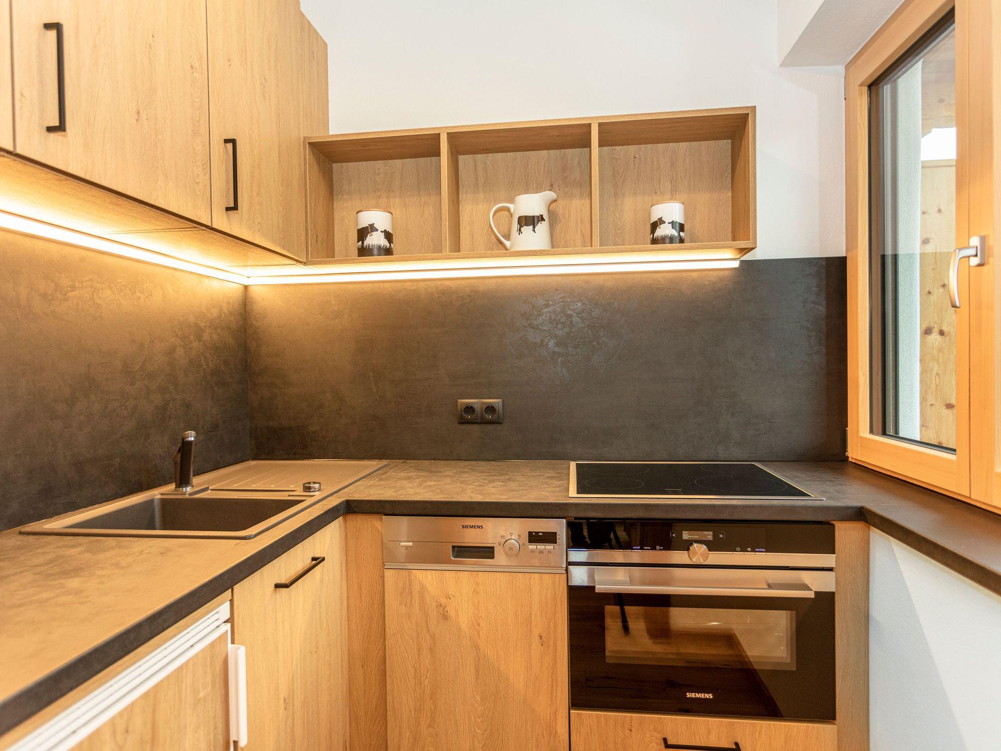 Ferienwohnung mit Blick auf den Wildseeloder, Balkon und große Sonnenterrasse mit Liegestühlen/ Hängematte und Griller. Komplett eingerichteter Küche mit Kaffeemaschine und Wasserkocher, Geschirrspüler und E-Herd mit Backofen, gemütliche Essecke, FLAT-TV, Radio, gratis WLAN, Dusche/WC.