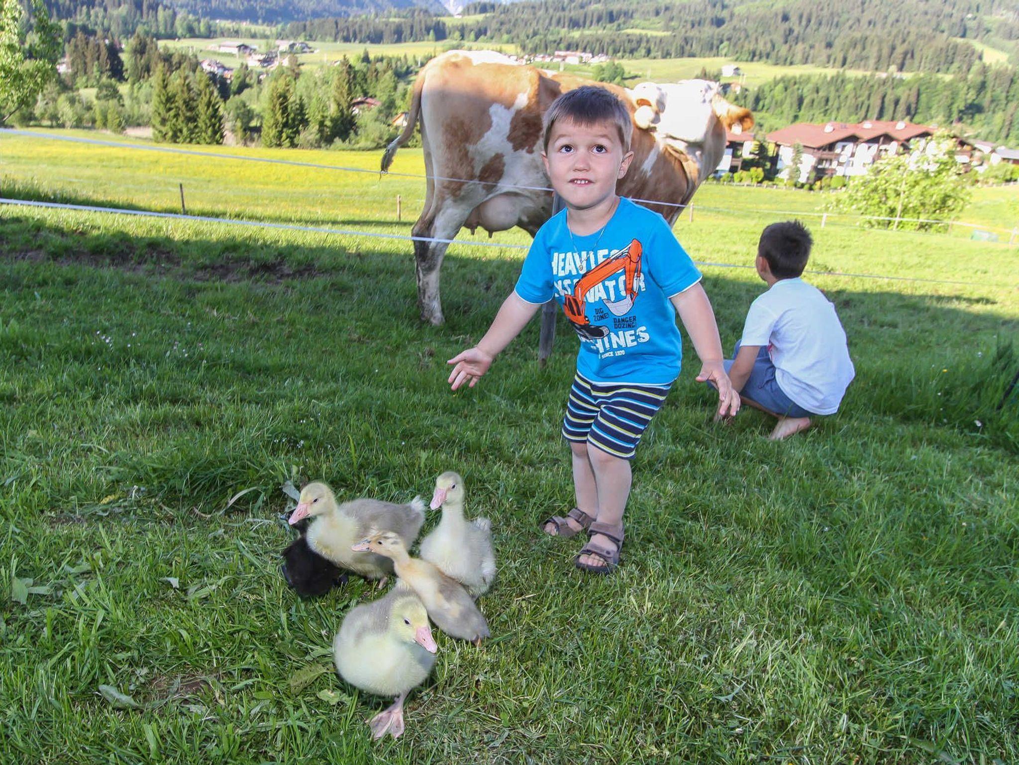 Schafe, Hasen, Enten, Hühner, Katze, Bienen und Kühe mit ihren Kälbern . Das kennenlernen und füttern unserer Tiere am Hof ist für die Kinder ein Erlebnis. Die umliegenden Hänge direkt neben dem Haus laden im Winter zum Bob fahren und zur Schneeballschlacht ein.