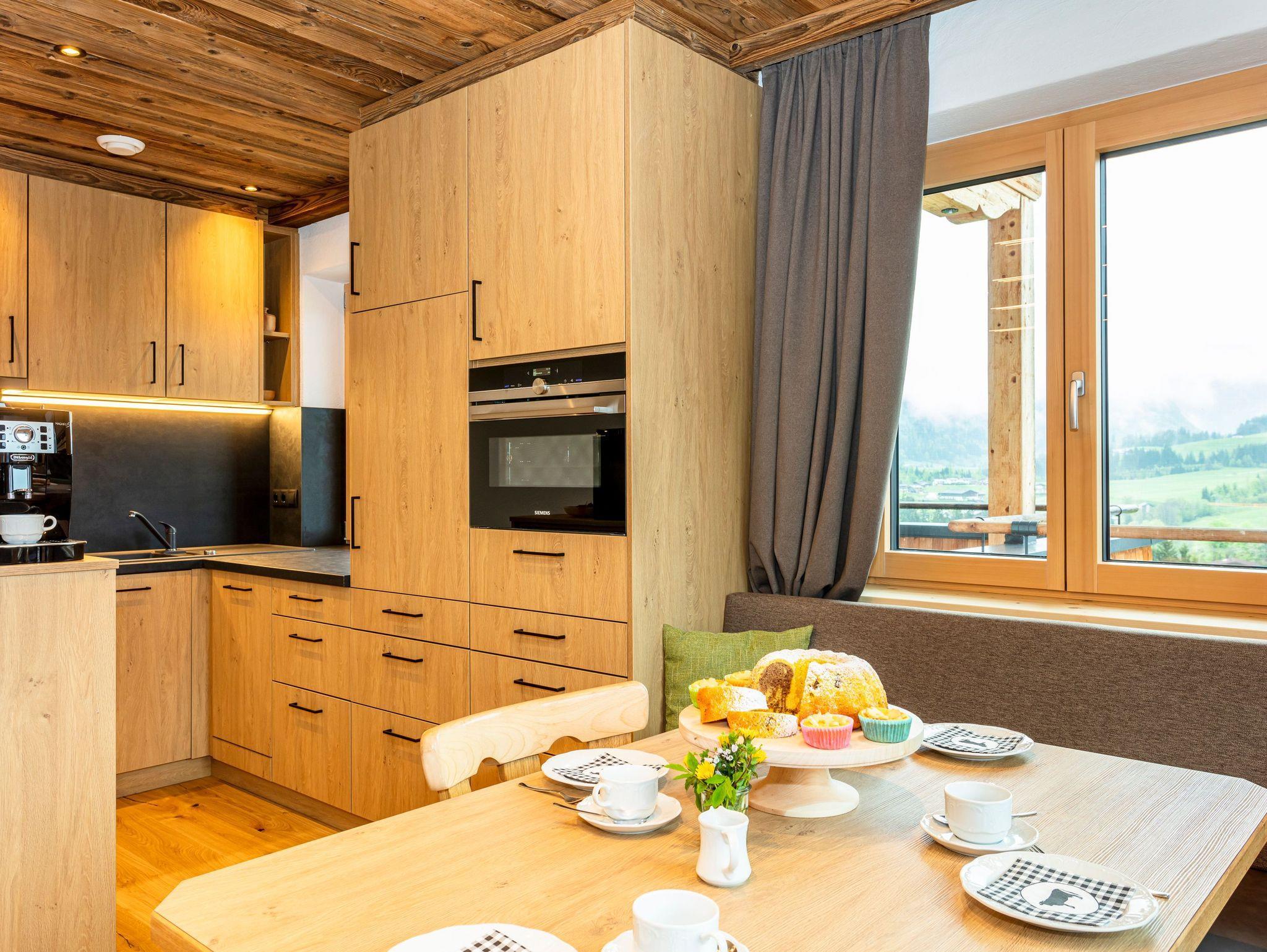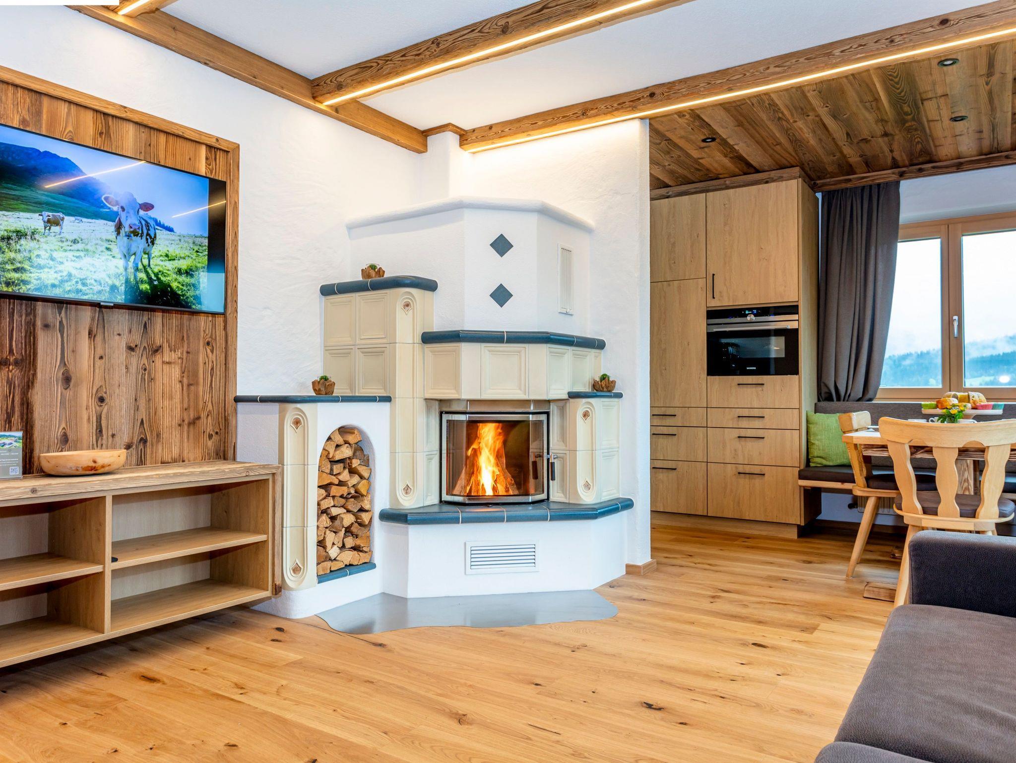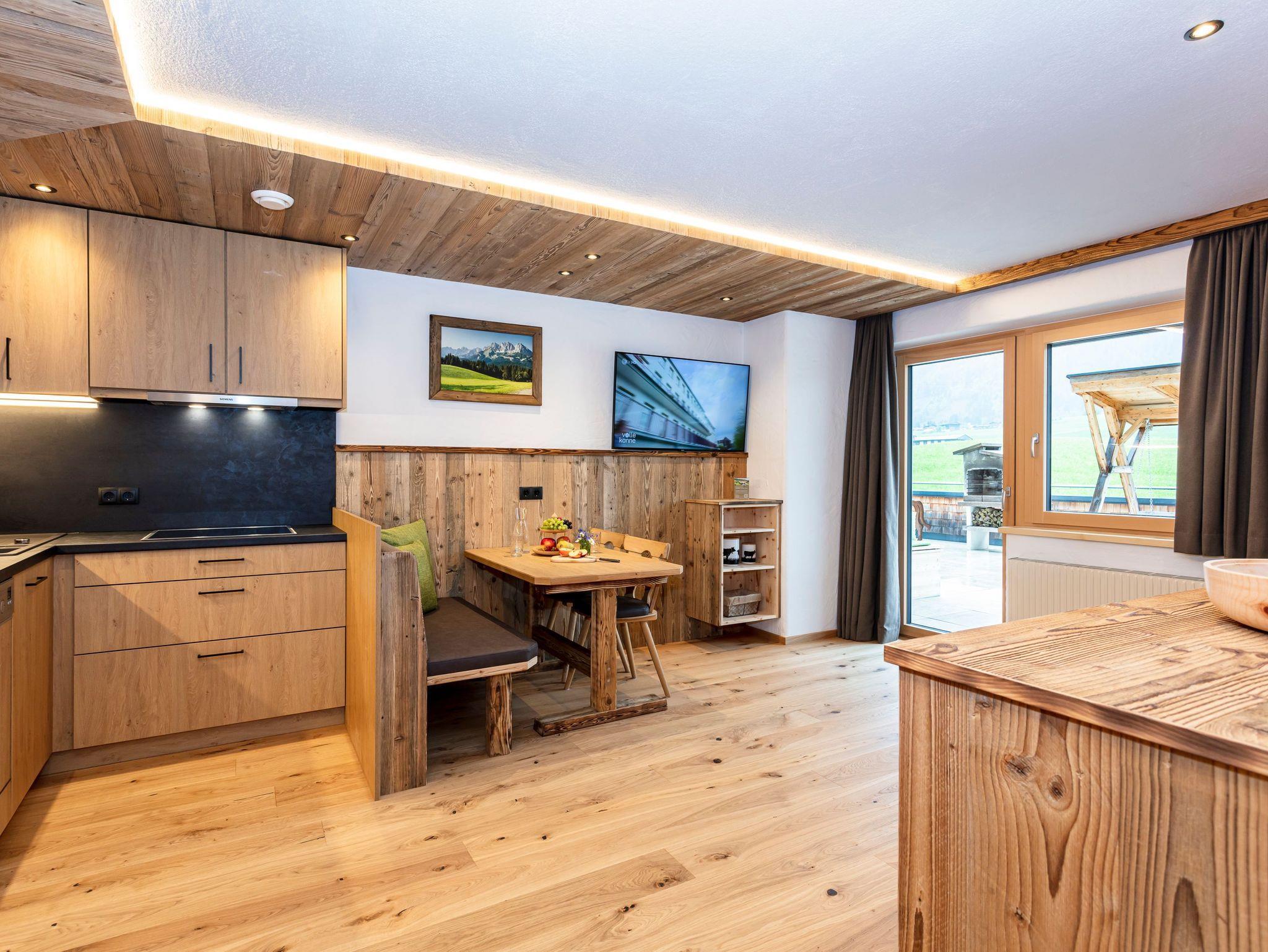 Wohlfühlambiente, in dieser Wohnung genießen Sie den Sonnenaufgang mit herrlichen Blick auf Fieberbrunn, die Buchensteinwand und den Spielberg. Im Wohnzimmer befindet sich ein gemütlicher Kachelofen mit Glastüre, zwei getrennten Schlafzimmern, komplett eingerichteter Küche mit Kaffeemaschine und Wasserkocher, Geschirrspüler und E-Herd mit Backofen, gemütliche Essecke, separater Wohnbereich mit Wohnlandschaft, FLAT-TV, Radio, gratis WLAN, Dusche/WC, Flur mit Garderobe und Balkon große Sonnenterrasse.
