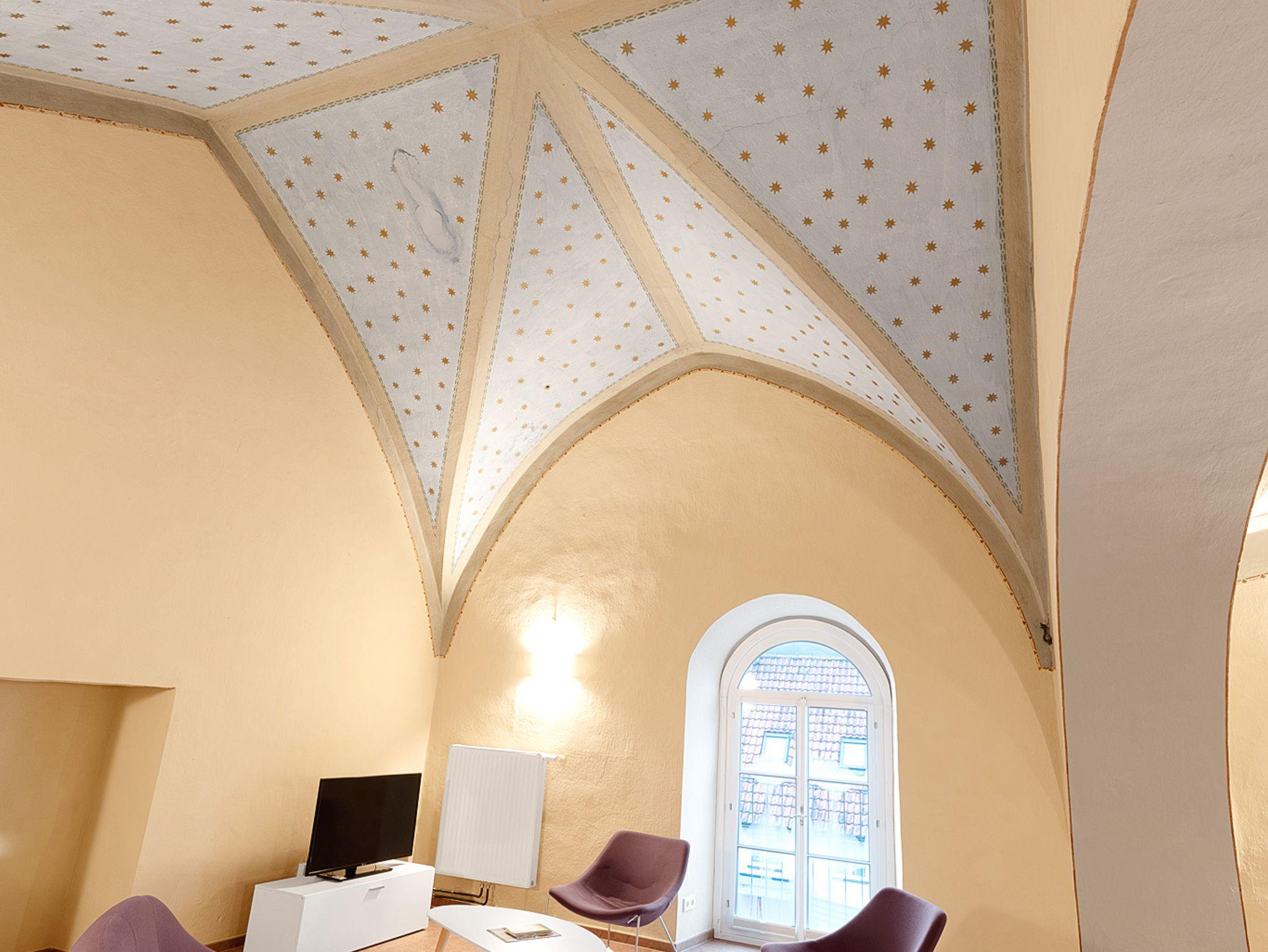Wenn Ihr Urlaub nicht nur wunderschön, sondern einzigartig werden soll, ziehen Sie doch auch einmal unser außergewöhnliches Apartment im ersten Stock in Betracht, eine ehemalige Kapelle mit rund 150 m² Wohnfläche. Der Sternenhimmel im großzügigen Wohnschlafraum schenkt Ihnen schon morgens beim Erwachen ein luxuriöses Lebensgefühl und viele Bögen und Nischen, sowie antike Einrichtungsgegenstände vermitteln ein einzigartiges Wohnambiente. Eine mit allen Annehmlichkeiten ausgestattete Küche ladet ein zu einem genussvollen Frühstück am runden Tisch. Die restlichen Räumlichkeiten beinhalten ein Schlafzimmer mit Doppelbett, ein Bad mit Dusche und WC sowie ein großzügiger Vorraum mit altem Mobiliar. Ein Wohlfühl-Urlaub in unverwechselbarer Atmosphäre, das bekommen Sie nur bei uns.