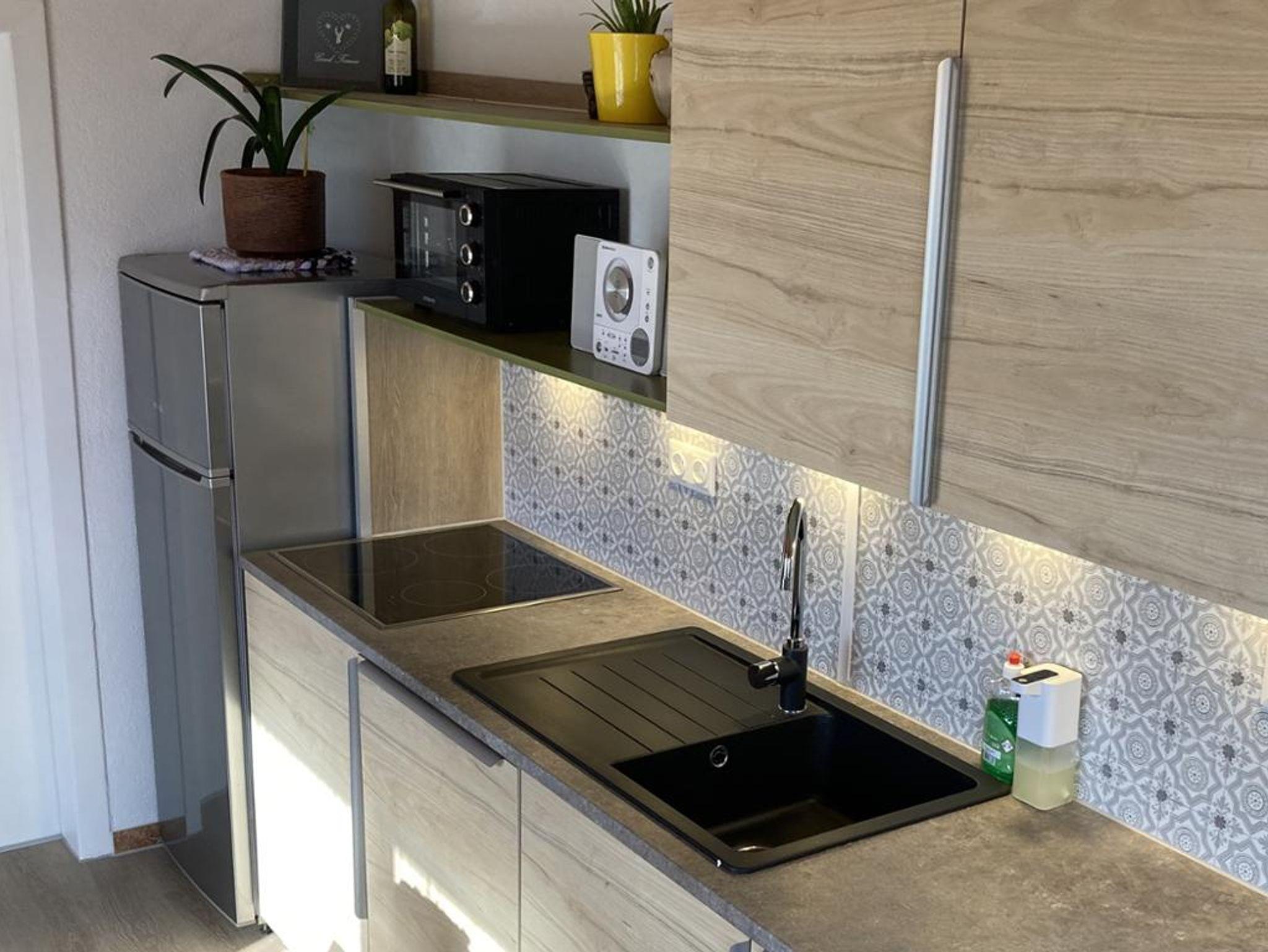 In der Wohnküche befindet sich eine neue Küchenzeile mit Kühl-/Gefrierkombinationsgerät, Induktionskochfeld, Geschirrspüler und Kaffeemaschine sowie ein großzügiger Essplatz am Fenster. Geschirr, Küchenutensilien, Putzmittel und Staubsauger werden zur Nutzung zur Verfügung gestellt. Die Bücher, Gesellschaftsspiele, Puzzle und Spielsachen im Wohnbereich können ebenfalls genützt werden und wir bieten kostenfreies WLAN für unsere Gäste. Im Badezimmer befindet sich eine Waschmaschine.
