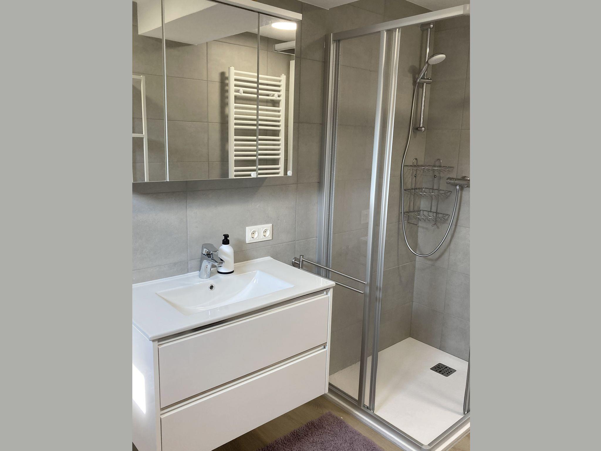 Das Badezimmer mit Fenster ist neu und modern gestaltet und ausgestattet mit WC und Dusche sowie Waschtisch inkl. Spiegelschrank.