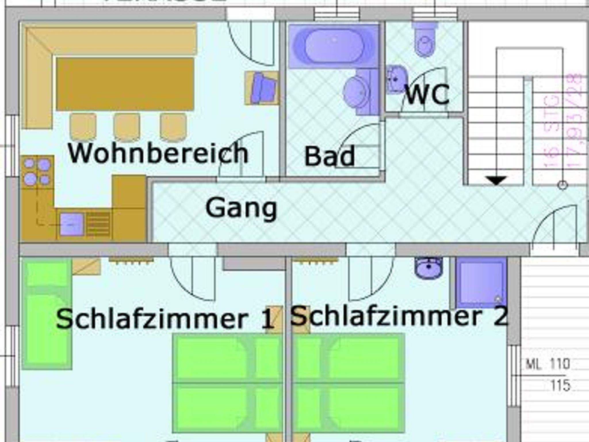 Die Ferienwohnung ist im 1. Stock mit großer Terrasse und Balkon. Ein großes Bad mit Badewanne sowie seperates WC. Die Wohnküche ist mit einer Kaffeemaschine, Geschirrspüler, Wasserkocher, E-Herd mit Backrohr usw. bestens ausgestattet. In der Wohnung befinden sich 2 Schlafzimmer, jeweils mit Doppelbett. Eines der beiden Schlafzimmer mit zusätzlicher Schlafcouch und Einbaudusche. Selbstverständlich steht auch ein Fernseher zur Verfügung.