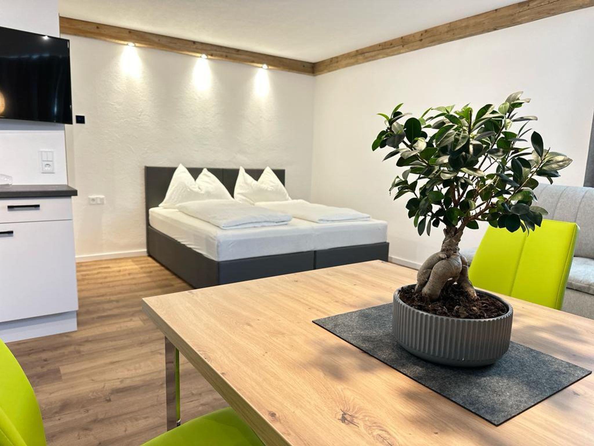 Appartement (35 m²) 1 bis zu 4 Personen, voll ausgestatte Küche ink. Kaffeemaschiene, Doppelbett (Einzelbetten möglich), Essecke, Bad mit Dusche und WC, Digital-SAT-TV, gratis W-Lan, große Terrasse südseitig mit Stadt und Dolomitenblick, Parkplatz