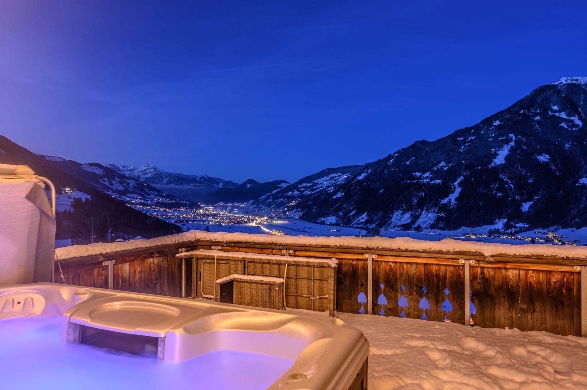 Nehmen Sie sich eine Auszeit, machen Sie es sich in unserem warmen Whirlpool bei einem Glas Wein bequem, entspannen Sie sich und genießen Sie dabei den einzigartigen Ausblick auf die Zillertaler Bergwelt.