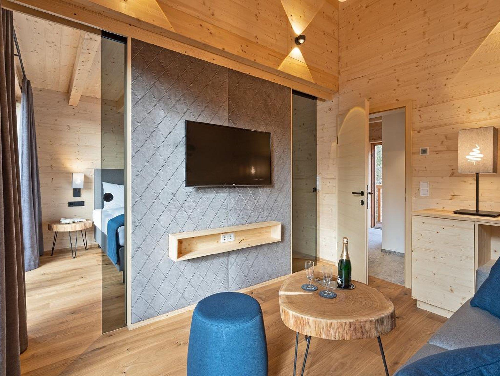 Das Zimmer Waldblick besteht aus 2 getrennten Doppelzimmern, Wohnraum und einem Bad mit Regendusche. Es bietet Platz für 4 Personen. Egal ob mit Freunden oder der Familie, das Baumhotel Waldblick bietet Platz für gemeinsame Abende und ist auch Rückzugsort für erholsame Stunden.