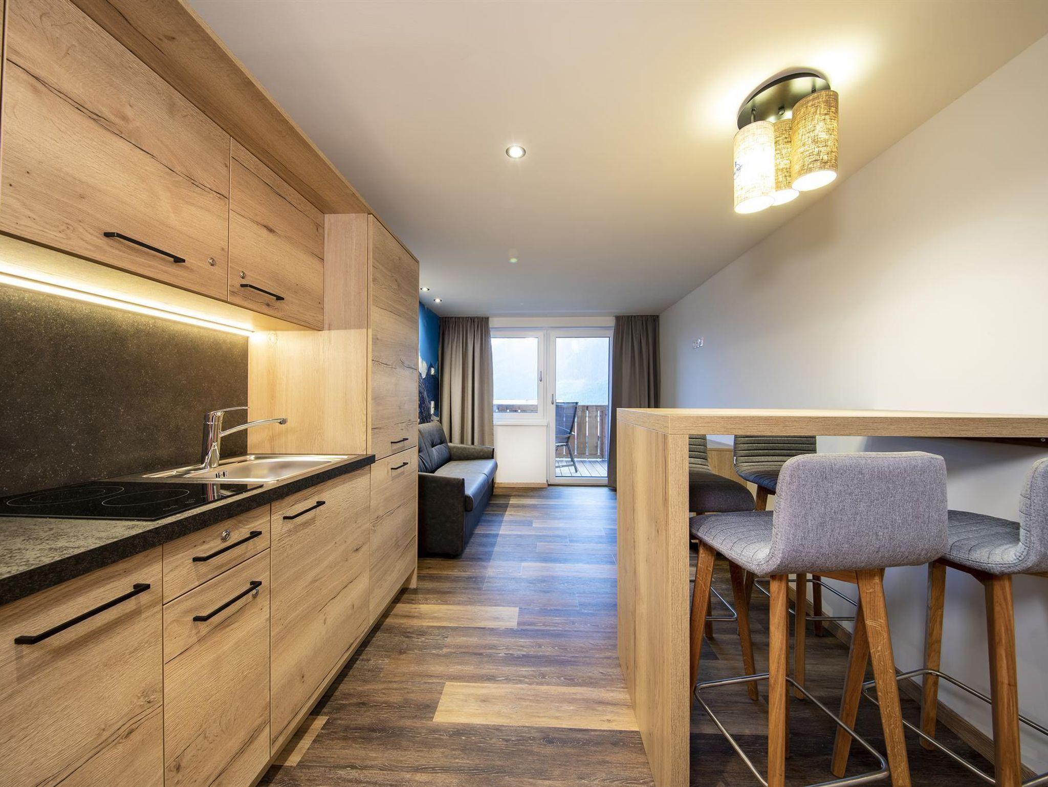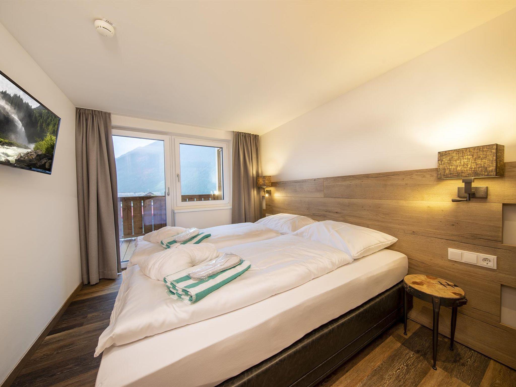 Die im Frühjahr 2019 komplett renovierten Hotelappartements (für 1-4 Pers.) im alpin-modernen Design wurden mit natürlichen Materialien ausgestattet. Die allergikergerechte Ausstattung sorgt für Wohnkomfort mit höchsten Ansprüchen. Dieses Appartement verfügt über ein getr. Schlafzimmer, einem Wohnraum mit Ausziehcouch und getr. WC und Badezimmer. Vom eigenen Balkon genießen Sie den Panoramablick auf die Berge.