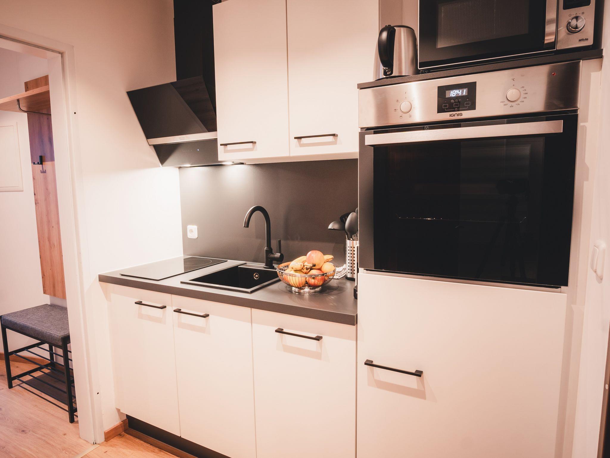 Das Appartement bietet eine voll ausgestattete, moderne Küche mit E-Herd, Backofen, Geschirrspüler, Mikrowelle, Nespresso Kaffeemaschine, Kühlschrank, Wasserkocher, Geschirr und Besteck.