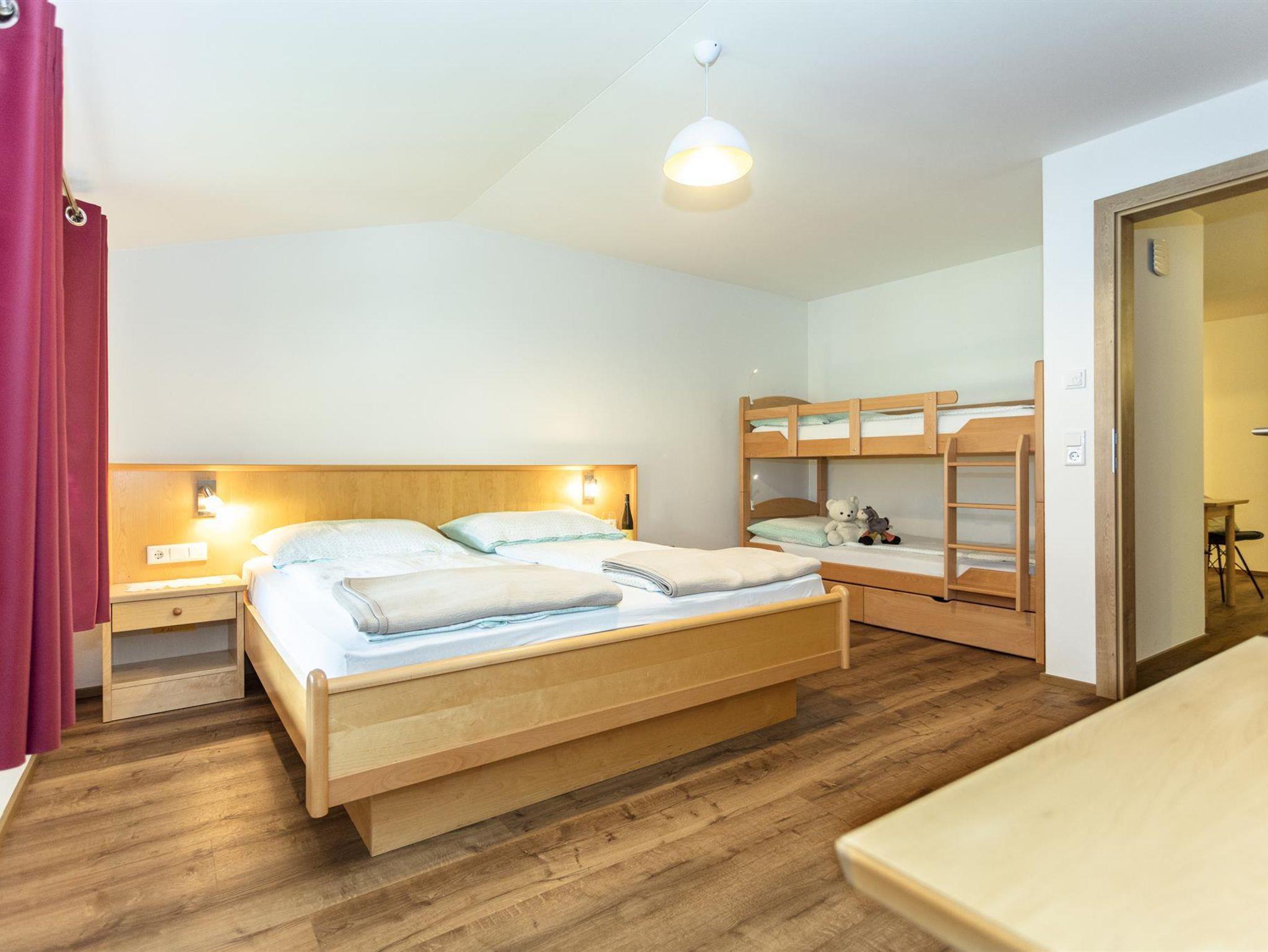 Die Ferienwohnung Felix (4-10 Personen) liegt im zweiten Stock unseres Hauses und verfügt über zwei Schlafzimmer, zwei Badezimmer und eine moderne Wohnküche. Sie ist ca. 90 m2 groß und bietet ausreichend Platz für die ganze Familie oder aber auch Freunde, die einen erholsamen Urlaub inmitten der Natur verbringen wollen. Pro Schlafzimmer stehen ein Doppelbett und ein Stockbett zur Verfügung und auch die Couch im Wohnbereich kann zu einem Bett umfunktioniert werden (Liegefläche 253/138 cm). Die Küche ist voll ausgestattet mit Herd, Backofen, Kaffeemaschine, Wasserkocher und Geschirrspüler und es gibt auch eine Waschmaschine. Ebenfalls gehört zu der Wohnung ein großzügiger Balkon.