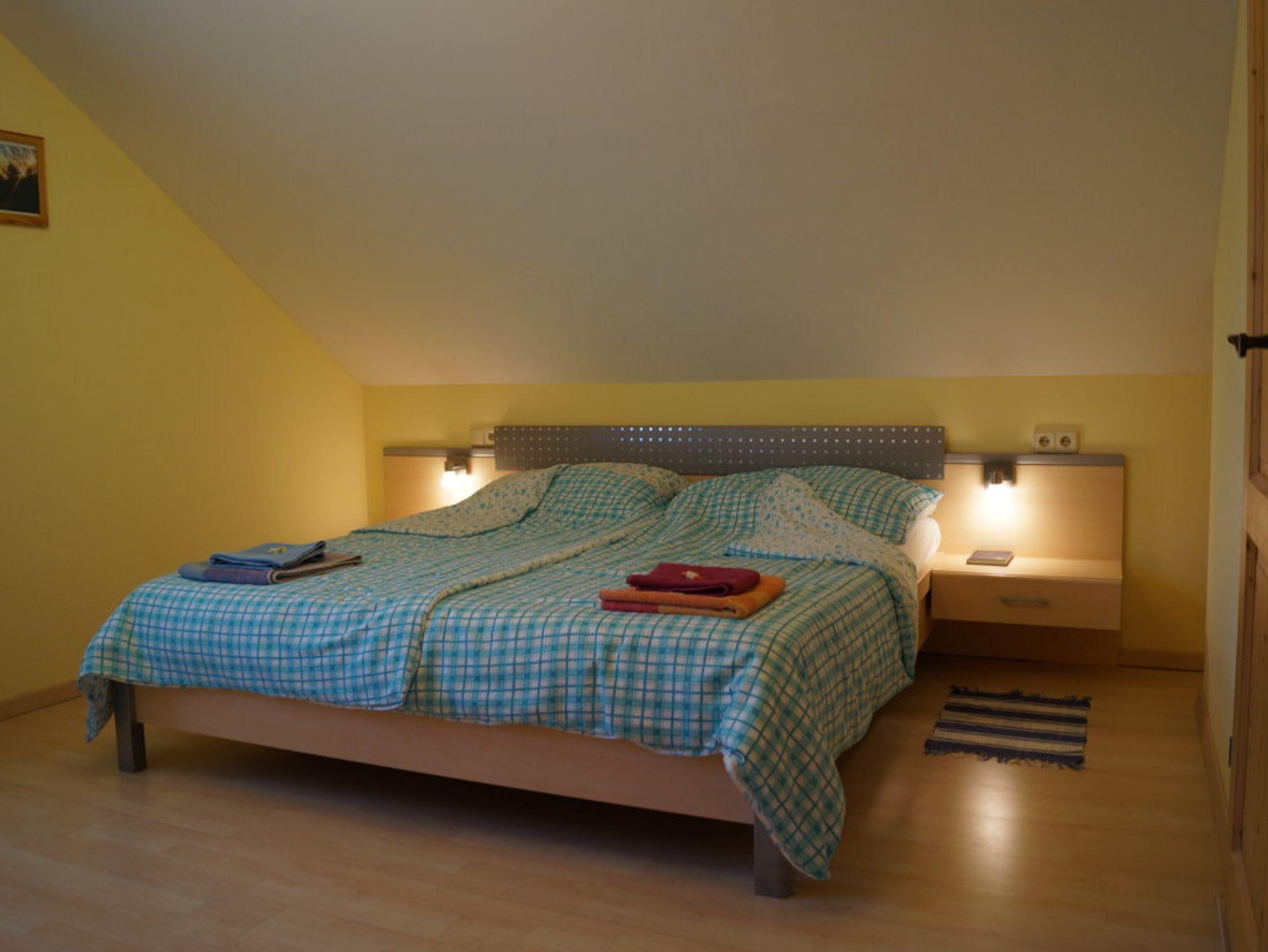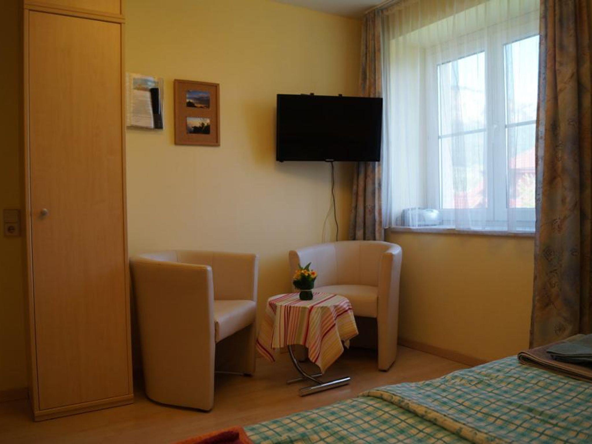 Die Zimmereinrichtung besteht aus einem Schrank, einem Doppel-Bett, zwei Nachtkästchen, einem kleinen Tisch und zwei Fauteuille-Stühlen. Der Flachbild-TV hängt an der Wand und hat SAT-Receiver - die Abstandsbedienung dazu ist daneben im Hängeordner bei der Gästemappe. Weiters gibt es einen Radio-CD-Player, Ventilator, natürlich W-LAN, Bettvorleger, Fußbodenheizung unter dem Laminatboden und Schallisolierung. Das Fenster hat einen Rolladen und Fliegengitter. Bettwäsche und Handtücher werden beigestellt.