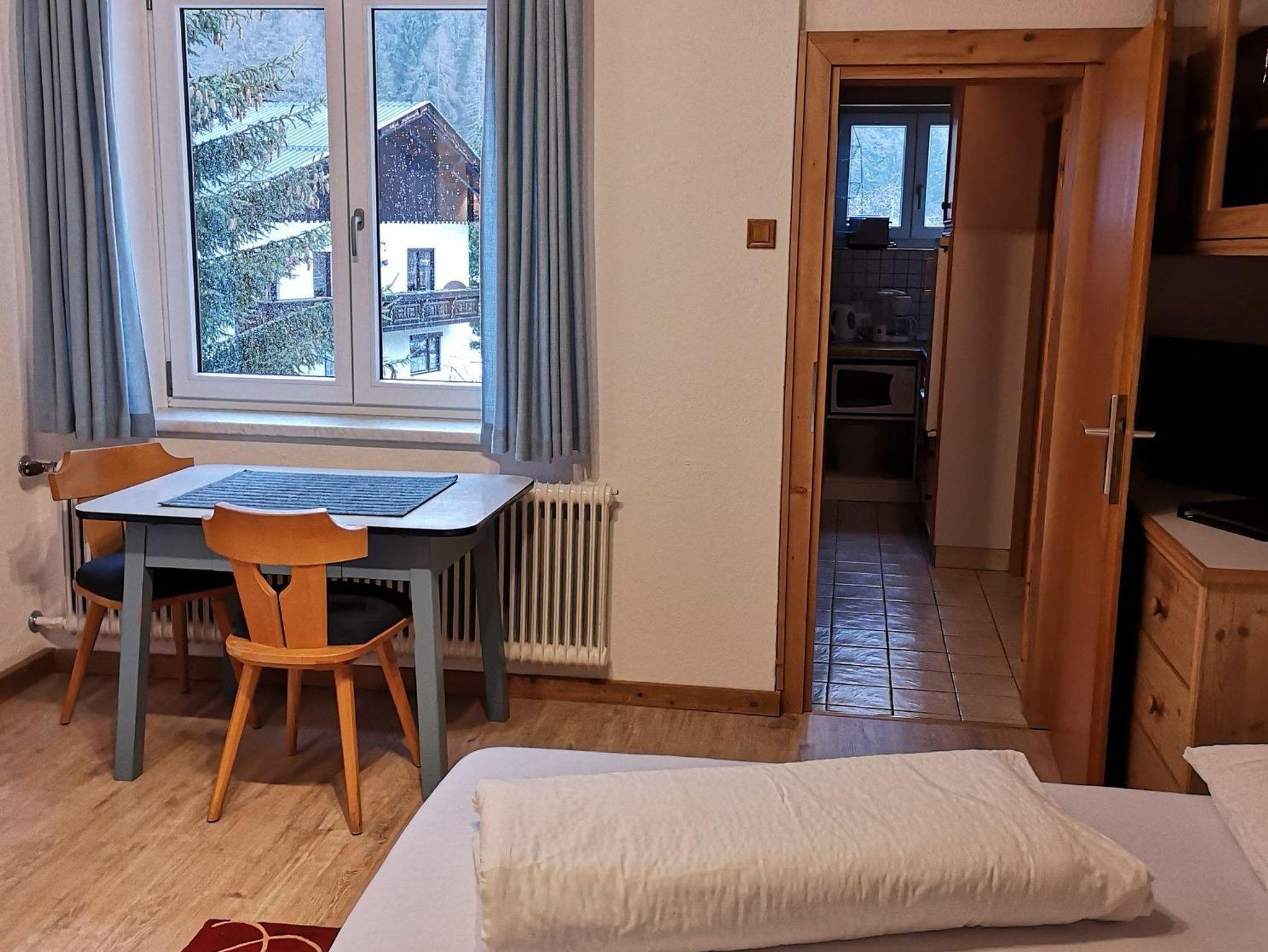 Studio mit 20m², bestehend aus einem Wohn-Schlaf-Essraum mit Doppelbett, kleiner, voll ausgestatteter Küche (4-Platten-Herd mit Backofen, Kühlschrank, Wasserkocher, Kaffeemaschine, Toaster, Microwelle) sowie DU/WC.