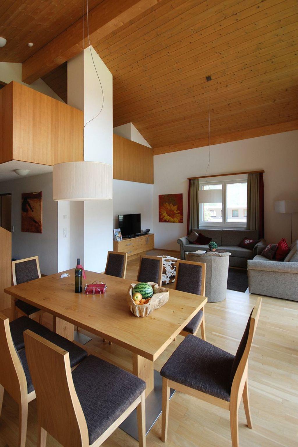 Die Lodge ist Teil einer Gruppe von Wohngebäuden im Chalet-Stil und wurde in qualitativ hochwertiger Bauweise errichtet. Sie bietet auf ca. 126m² Platz für bis zu zehn Personen. Die Ferienwohnung erstreckt sich über zwei Ebenen im ersten und zweiten Obergeschoss des Gebäudes. In der unteren Ebene liegt der große, zweigeschossige Wohn- und Essbereich mit einer offenen, sorgfältig ausgestatteten Küche. Neben einer Spülmaschine finden Sie hier auch ein Cerankochfeld mit Backofen, einen Toaster, Wasserkocher und eine Kaffeemaschine vor. Der Esstisch lädt nach dem Kochen zum gemeinsamen Speisen ein. Die gemütliche Sofaecke mit Satelliten-TV mit DVD lassen hier keine Wünsche offen. Weiterhin befinden sich auf der ersten Ebene drei helle Schlafzimmer mit jeweils einem Doppelbett. Ein Schlafzimmer verfügt über ein eigenes Bad mit ebenerdiger Dusche, WC und Fön. Ein weiteres Badezimmer mit ebenerdiger Dusche, WC und Waschbecken kann ebenfalls auf der unteren Ebene genutzt werden. Auf der oberen Ebene werden Sie von einer offene Galerie empfangen, die einen Blick in den Wohn- und Essbereich bietet. Weiterhin befindet sich hier eine separate Suite mit großzügigem Schlafbereich mit Doppelbett, Sofaecke mit Schlafcouch (zwei weitere Schlafgelegenheiten) und ein TV. Die Suite verfügt darüber hinaus über ein Ensuite-Bad mit ebenerdiger Dusche, WC und Fön. Eine eigene Ankleide mit Einbauschränken und Safe komplettieren hier das Angebot. Genießen Sie vom Panoramafenster aus den Blick in die Tauern.