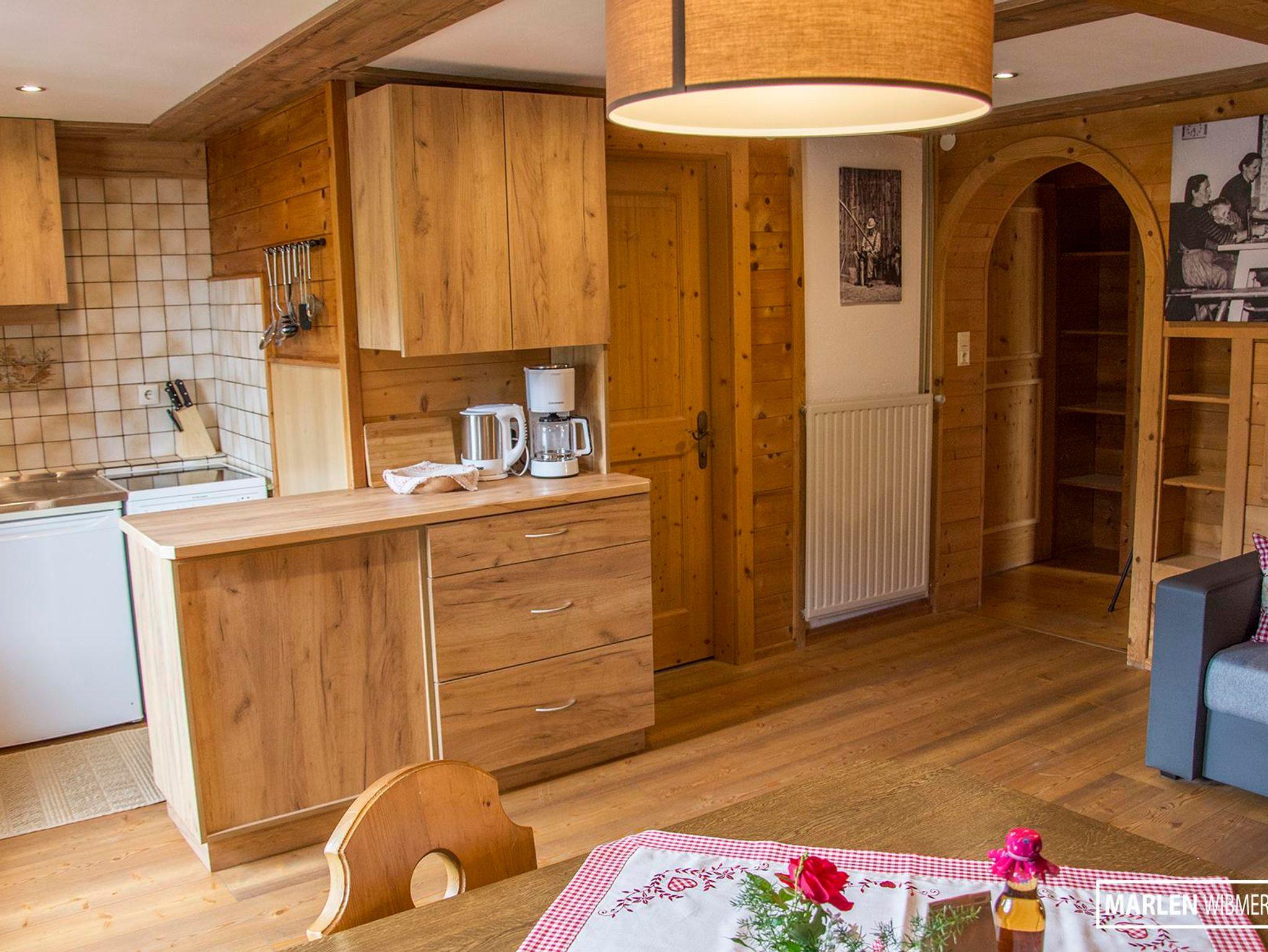 Fewo Matrei ist ausgestattet mit Wohnküche (neuem Küchenblock) u. Südbalkon, neu renovierter Dusche/WC, Doppelbettzimmer mit dahinterliegendem Dreibettzimmer, im rustikalen Stil mit viel Holz, Garderobe und Abstellraum. Koch-,u. Tafelgeschirr, sowie Handtücher, Föhn und Bettwäsche sind ausreichend vorhanden.