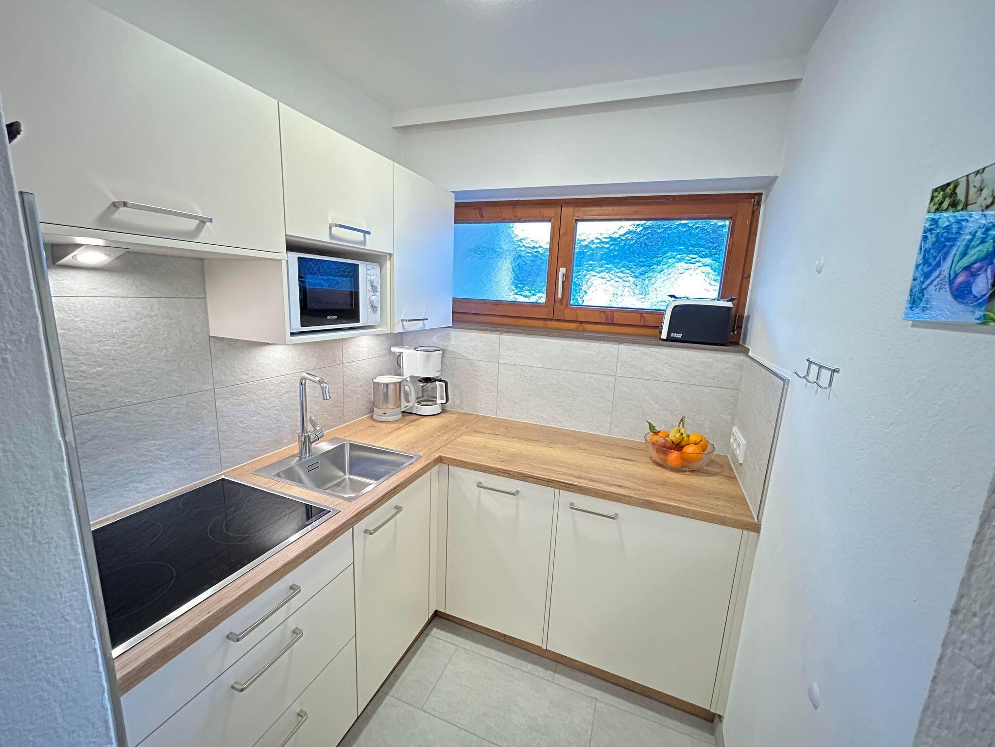 Wohnschlafzimmer mit Doppelcouch, gepolsterter Eßecke und Bauernkomode. Zweibettzimmer mit 2 Fauteuils und Tischchen, Wandvertäfelung. Große Schiebetüre zum Liegebalkon bzw. zur Gartenterasse. Vorraum mit Schrank. Frisch renoviertes Badezimmer mit Dusche, Waschbecken, WC und Heizstrahler. Seperate Küche mit 3-Platten-Herd, Dunstabzug, kompl. Geschirr, Kühlschrank, Geschirrspülmaschine, Mikrowellenherd, Kaffeemaschine. Farb-TV, Safe, Internetanschluss.