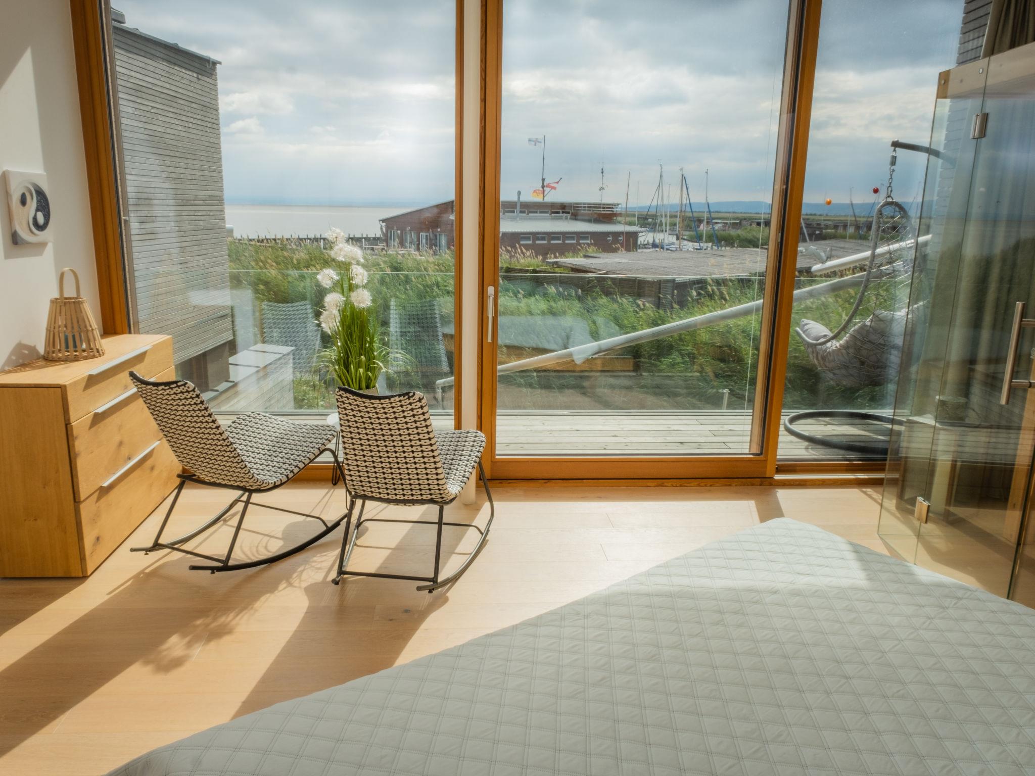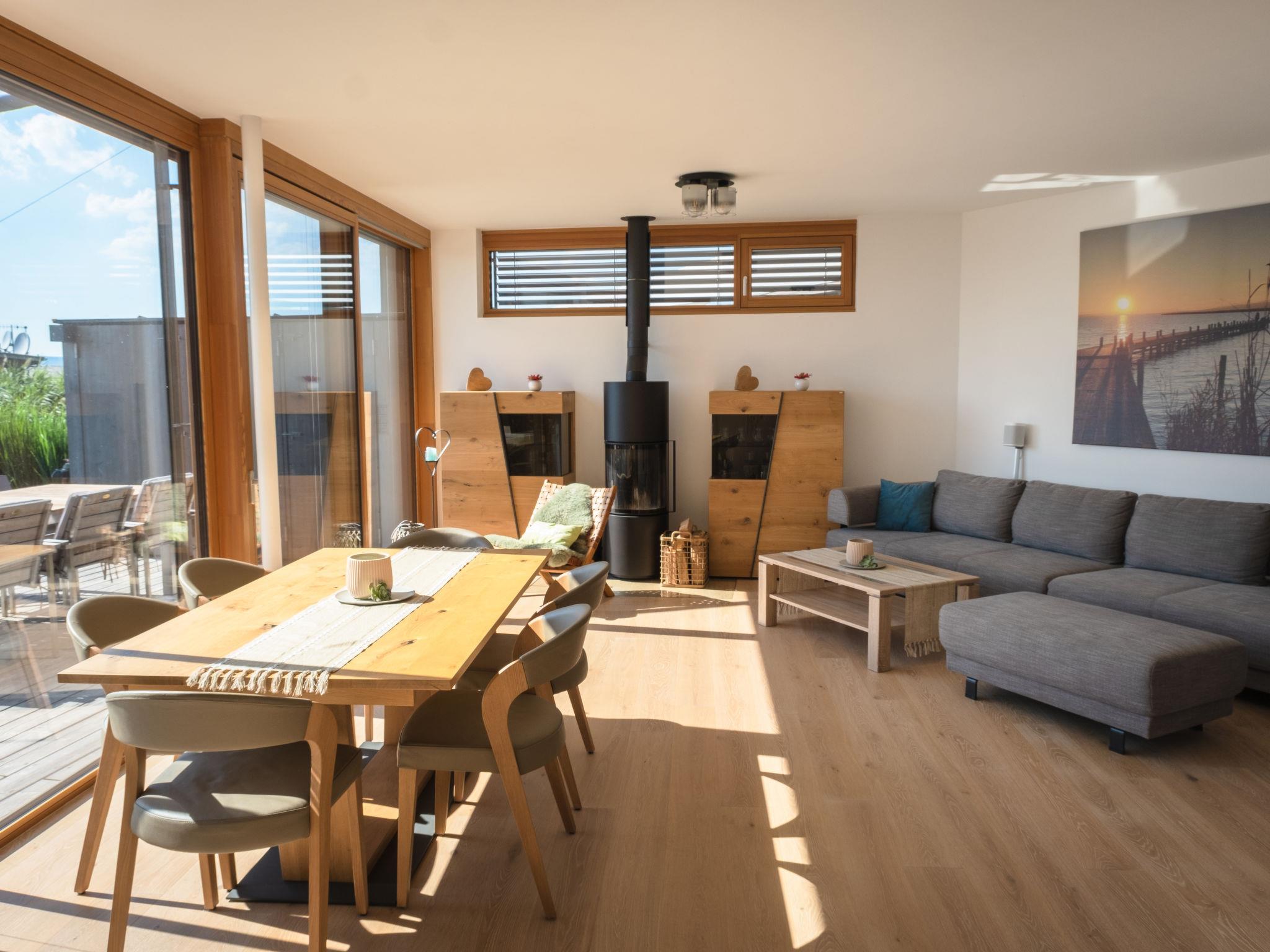 "Relax Lodge am See", 4-Zimmer-Reihenhaus 110 m2 auf 2 Stockwerken. Hell, sehr komfortabel und gemütlich eingerichtet: Wohn-/Schlafzimmer mit Schiebetür, Panoramafenster mit 1 Doppeldiwanbett, Schwedenofen und Esstisch. Ausgang zur Terrasse. Abgeschrägte, offene Küche (Backofen, Geschirrspüler, 4 Glaskeramikplatten, Toaster, Wasserkocher, Mikrowelle, Tiefkühler, elektrische Kaffeemaschine). Sep. WC. Obergeschoss: 1 grosses Doppelzimmer mit Panoramafenster. Ausgang zum Balkon. 1 Doppelzimmer mit Sat-TV und Internationale TV-Sender (Flachbildschirm). 1 kleines Zimmer, ohne Schrank mit 1 franz. Bett (1 x 160 cm, Länge 200 cm). Bad/Dusche, sep. WC, Doppelwaschbecken, Whirlbadewanne. Parkettboden. Grosse Terrasse 50 m2. Terrassenmöbel, Liegestühle (4), Abstellkammer. Sehr schöne Sicht auf die Lagune. Zur Verfügung: Waschmaschine, Wäschetrockner, Bügeleisen, Holz (gratis). Internet (Wireless LAN). Parkplatz, Garage Nr. 13 auf dem Grundstück. E-Ladestation. Bitte beachten: Nichtraucher-Unterkunft. Private Bootsanlegestelle. Eigener Eingang, Rauchmelder. Keine Partys und Veranstaltungen erlaubt!