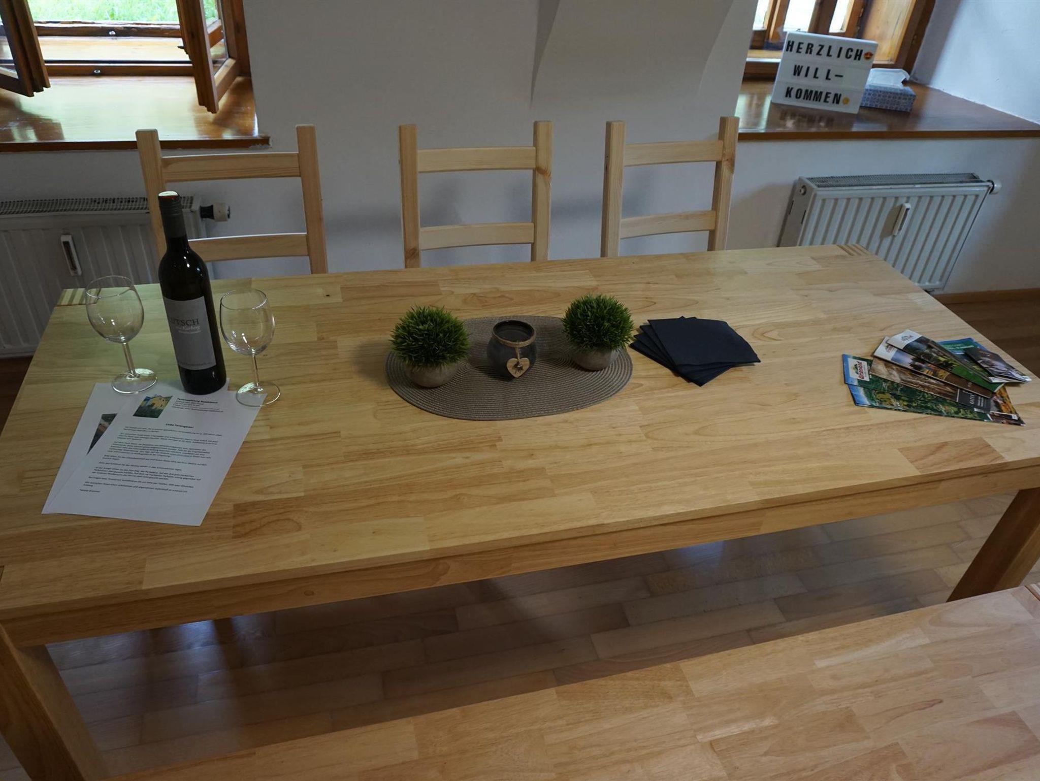 • ein Ess-/Wohnzimmer mit einer ausziehbaren Couch für bis zu 2 Personen und einem Vollholz-Esstisch mit dazugehöriger Bank und 2 Sesseln