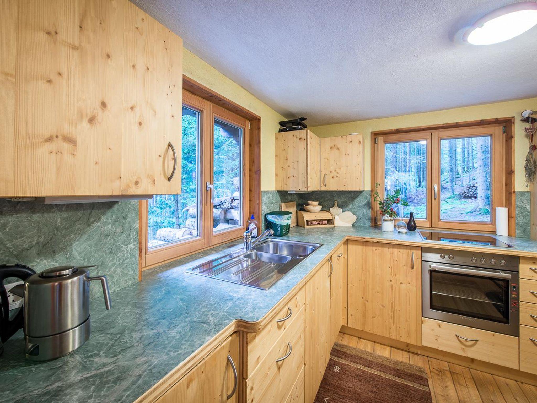 • Vollholz-Küche mit uriger Theke: Elektro-Herd (inklusive Backrohr), Kühl-Gefrierkombination, Geschirrspüler, Raclette, Wasserkocher, Geschirr und allgemeine Kochutensilien, Thermosflaschen