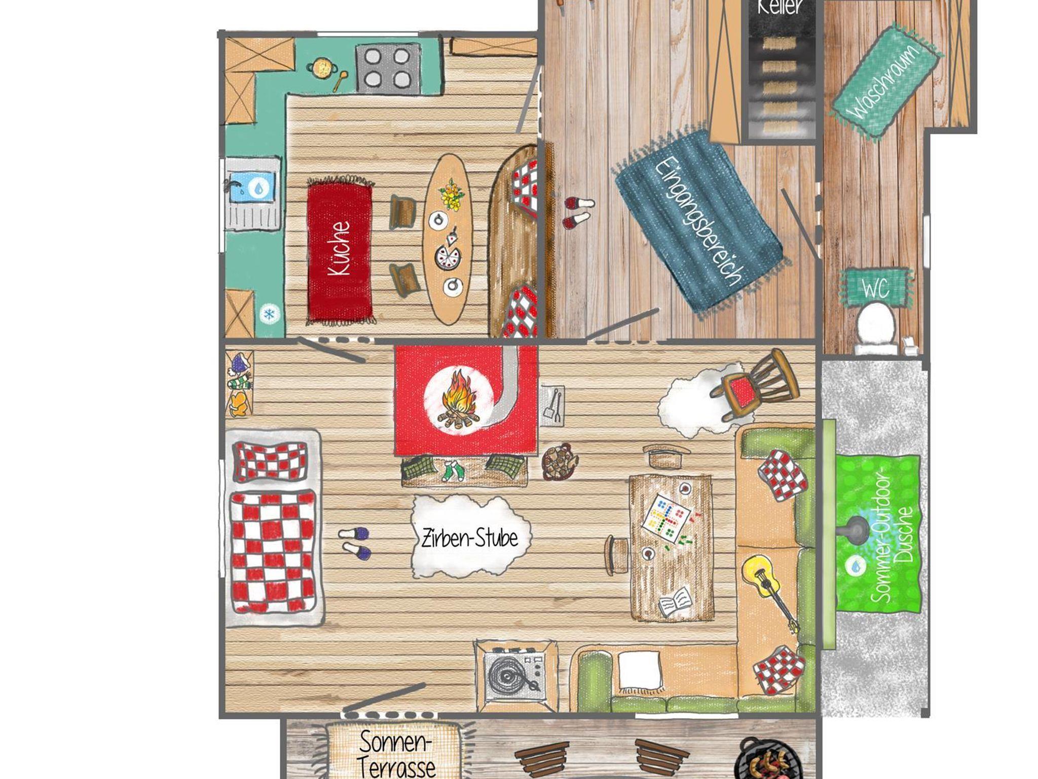 • Zirben-Stube: gemütliche Sitzecke, Lehnsessel mit Schaffell, Holzofen mit Ofenbank, zusätzliche Schlafmöglichkeit, Infrarot-Heizpaneel