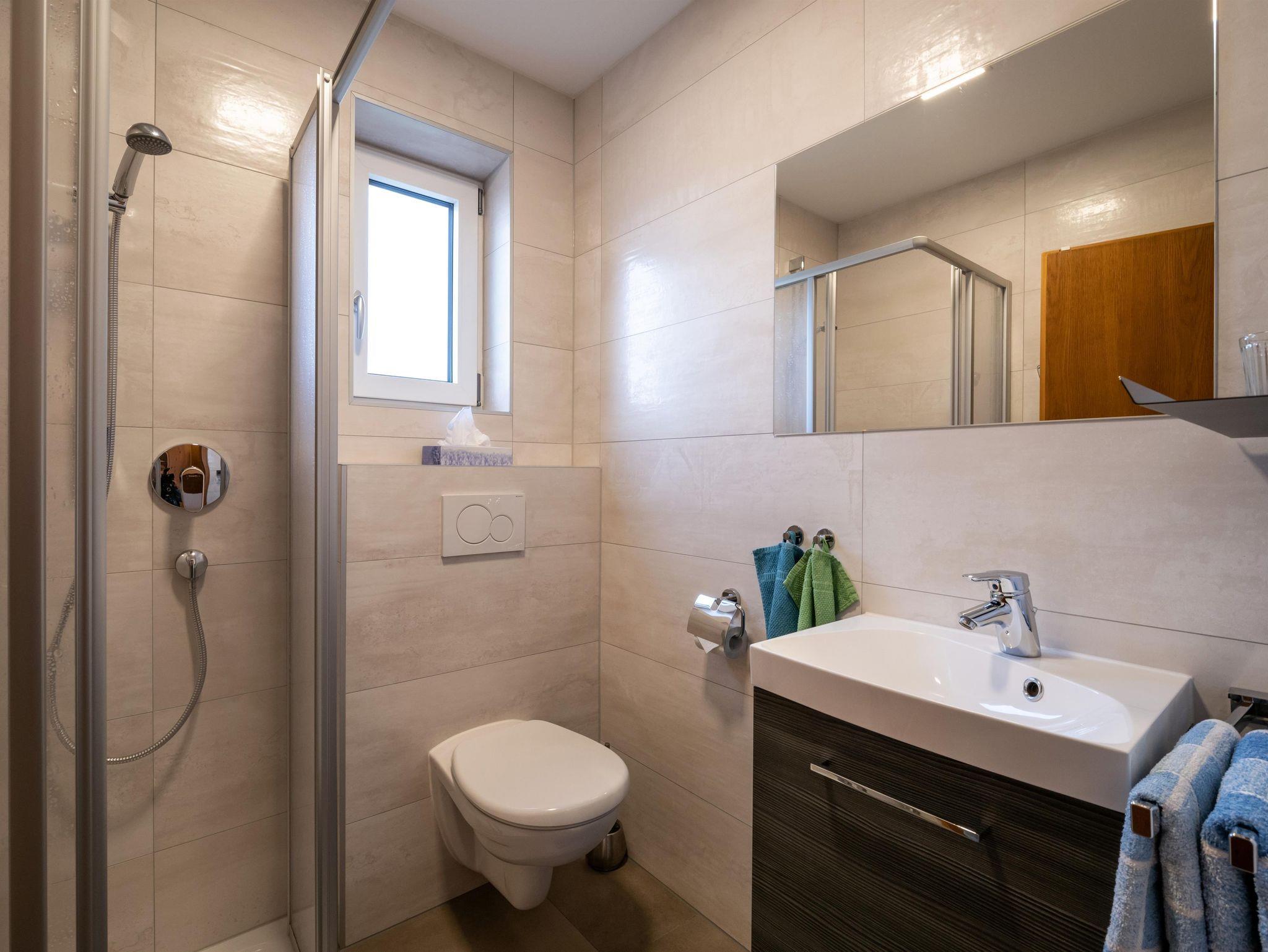 Unsere Ferienwohnung (ca. 47m²) für 2-4 Personen ist mit einem Schlafzimmer für 2 Personen, einem Wohn-Schlafraum mit Ausziehcouch für 2 Personen, Vorraum, Dusche/WC und Küche ausgestattet.
